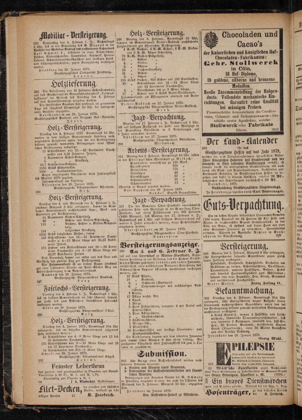 Dienstag den 4. Februar 1879 Vormittags 10 Uhr, werden in dem biesigen Gemeindewald Lohrberg nach verzeichnete Holzsorten unten den bei der Versteigerung bekannt gemacht werdenden Bedingungen einer öffent; lichen Versteigerung ausgesetzt: