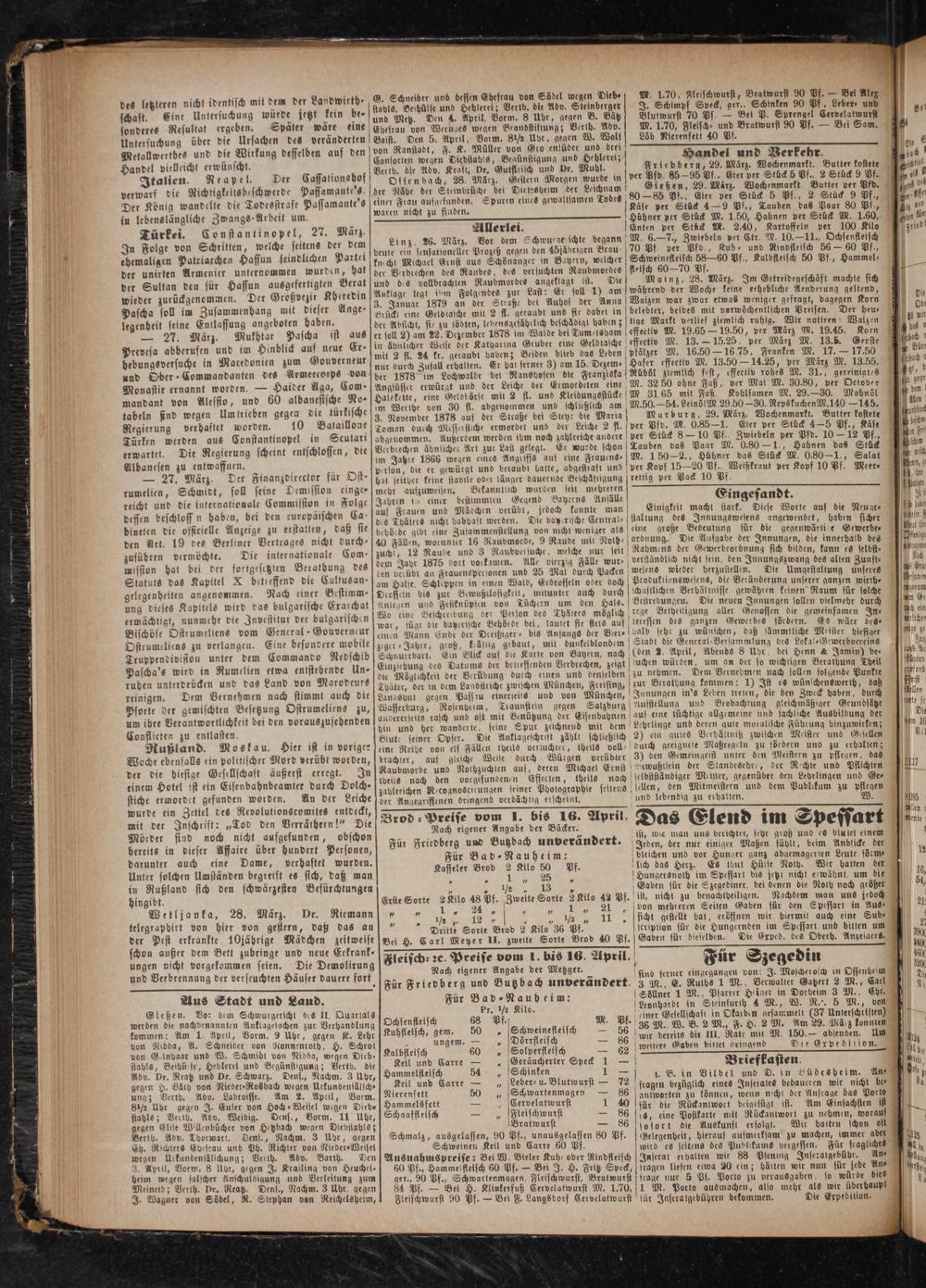 Friedberg, 29. März. Wochenmarkt. Butter kostete ver Pfd. 85—95 Pf. Eier per Stück 5 Pf, 2 Stück 9 Pf. HOießen, 29. März. Wochenmarkt. Butter per Pfd. 80— 85 Pf., Eier per Stück 5 Pf., 2 Stück 9 Pf., Käse per Stück 4— 9 Pf., Tauben das Paar 80 Pf., Hühner per Stück M. 1.50, Habnen per Stück M. 1.60, Enten per Stück M. 2.40, Kartoffeln per 100 Kilo M. 6.—7., Zwiebeln per Ctr. M. 10.—11., Ochsenfleisch 70 Pf. per Pfd., Kub⸗ und Rindfleisch 56— 60 Pf., Schweinefleisch 58—60 Pf., Kalbfleisch 50 Pf., Hammel⸗ fleisch 60 70 Pf.