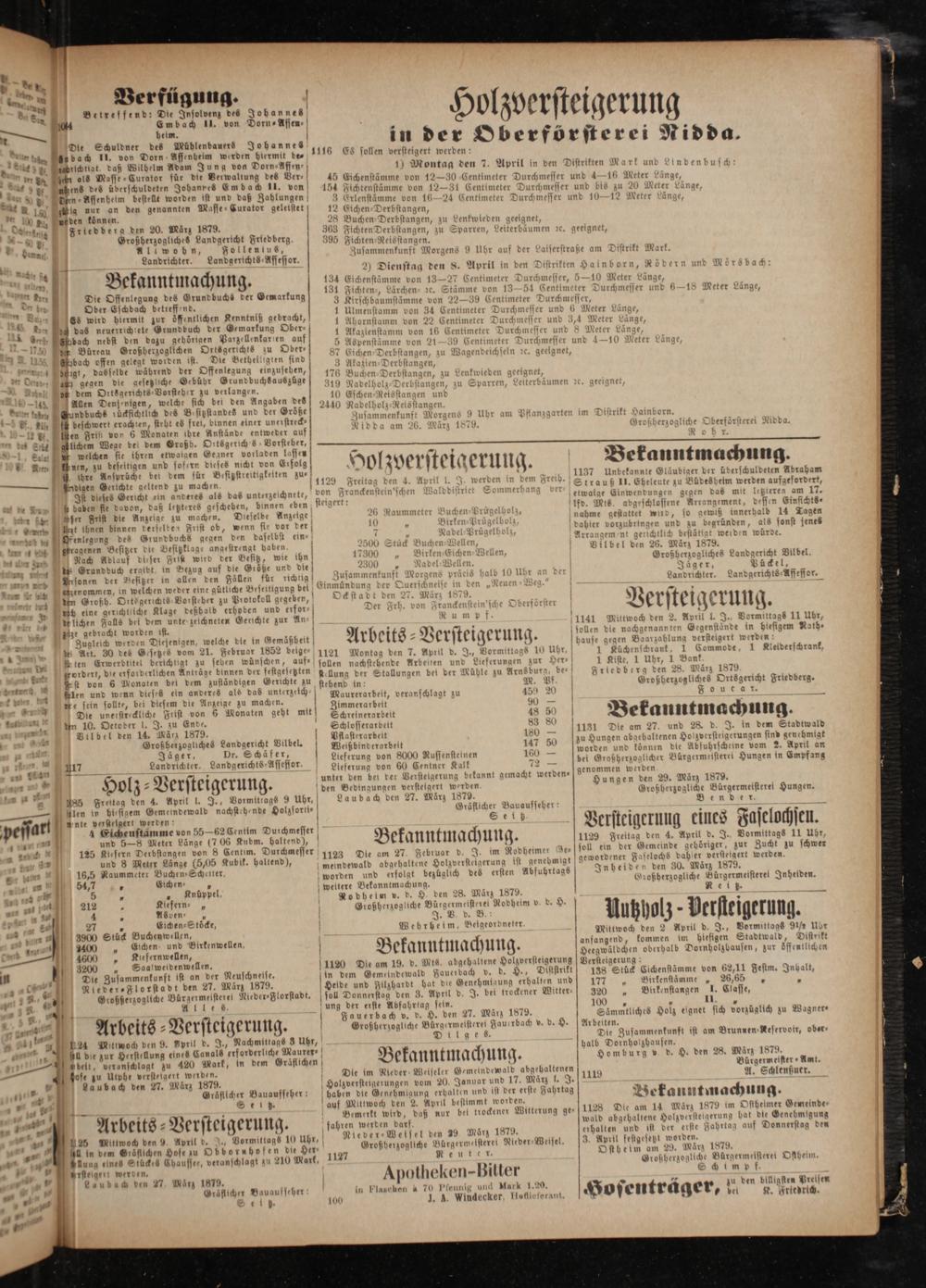 5„ e f f Fauerbach v. d. H. den 27. März 1879. Sämmtliches Holz eignet sich vorzüglich zu Wagner ee 1 Arbeits 7 Versteigerung. Großherzogliche Bürgermeisterei Fauerbach v. d. H. Arbelten. n dees*— 0 8* 0 5 1 a un N „ en bee eitwoch ven 9. April d. J., e Uhr, e Wee ist am Brunnen-Neservotr, ober , u die zur Herstellung eines Canals erforderliche Maurer- 0 a 0 8 8 98 f 379 — belt, veranschlagt zu 420 Mark, in dem Gräflichen Bekanntmachung. Homburg v ud. H. den 28. n 1 ofe zu Utphe versteigert werden. Die im Nieder Weiseler Gemeindewald abgehaltenen a 918 8 1 5 5 g 1119 1. Schleußuer. 3* Laubach den 27. März 1879. Holzversteigerungen vom 20. Januar und 17. Marz l. J. 5 4