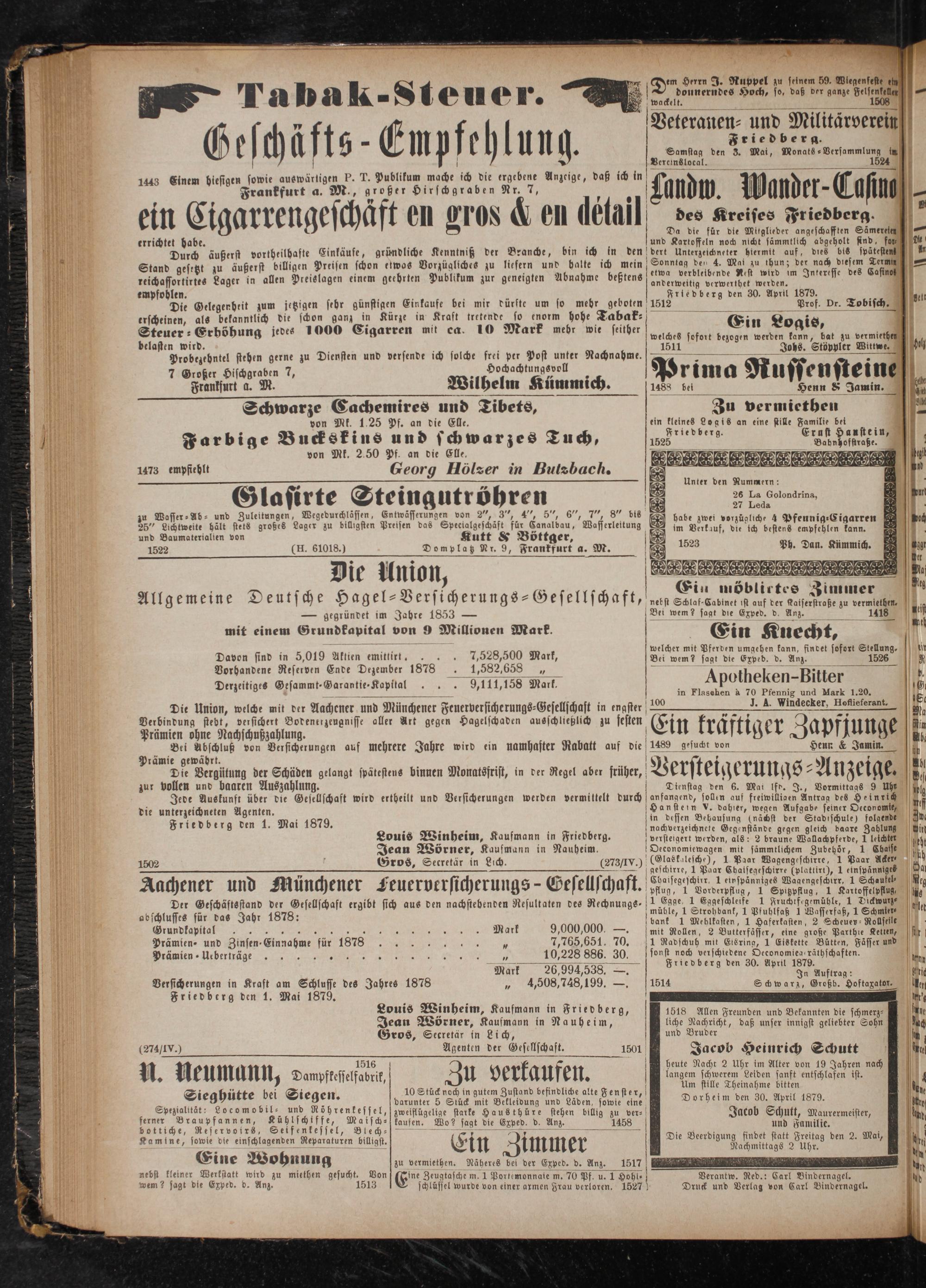 Mark Versicherungen in Kraft am Schlusse des Jahres 1878 75 Friedberg den 1. Mai 1879. Louis Winheim, Kaufmann in Friedberg, Jean Wörner, Kaufmann in Nauheim, Gros, Secretär in Lich, Agenten der Gesellschaft. 1501