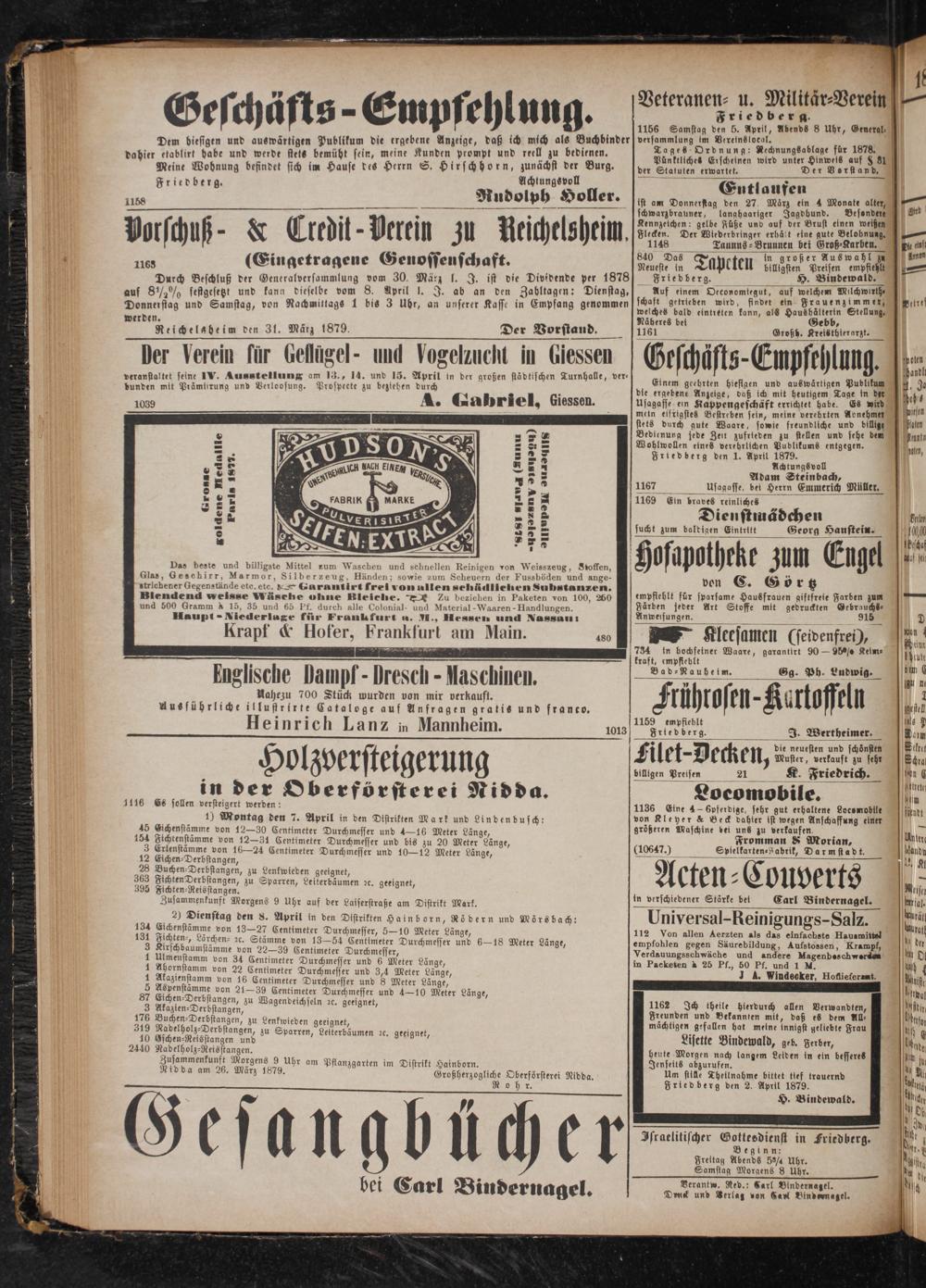 Friedberg. 1156 Samstag den 5. April, Abends 8 Uhr, General- versammlung im Vereinslocal. Tages Ordnung: Nechnungsablage für 1878. Pünktliches Erscheinen wird unter Hinweis auf 8 81