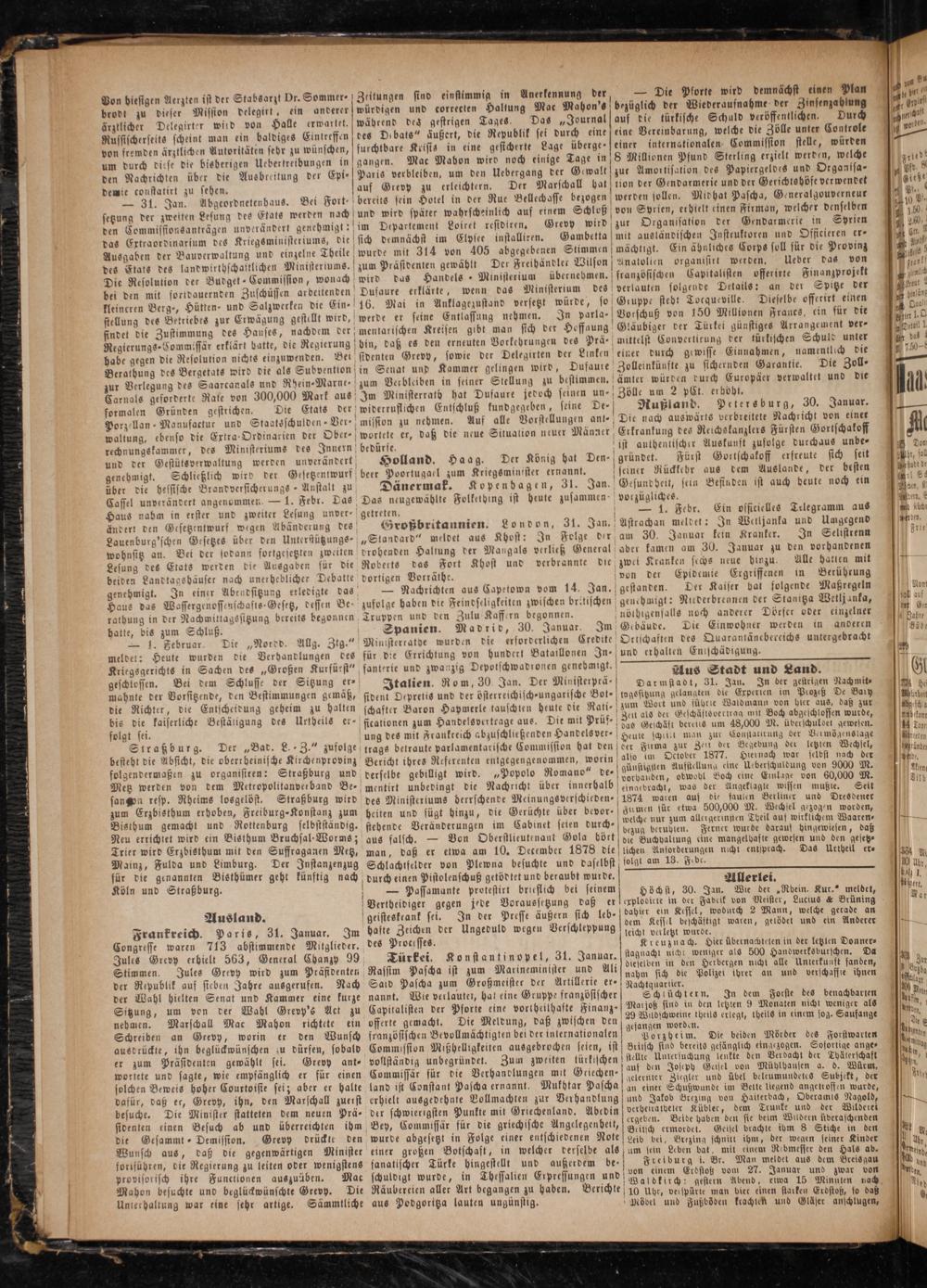 Von biesigen Aerzten ist der Stabsarzt Dr. Sommer- Zeitungen sind einstimmig brodt zu dieser Mission delegirt, ein anderer würdigen und correeten Haltung ärztlicher Delegirter wird von Halle erwartet. während des gestrigen Tages. Das„Journal Russischerseits scheint man ein baldiges Eintreffen des Debats“ äußert, die Republik sei durch eine von fremden ärztlichen Autoritäten sebr zu wünschen, furchtbare Krisis in eine gesicherte Lage überge⸗ um durch diese die bisherigen Uebertreibungen in gangen. Mac Mahon wird noch einige Tage in den Nachrichten über die Ausbreitung der Epi- Paris verbleiben, um den Uebergang der Gewalt demie constatirt zu sehen. auf Grevy zu erleichtern. — 31. Jan. Abgeordnetenbaus. Bei Fort- bereits sein Hotel in der Rue Bellechasse bezogen setzung der zweiten Lesung des Etats werden nach und wird später wahrscheinlich auf einem Schloß den Commissionsanträgen unverändert genehmigt: im Departement Loiret residiren. Grevy wird das Extraordinarium des Kriegsministeriums, die sich demnächst im Elysee installiren. Gambetta Ausgaben der Bauverwaltung und einzelne Theile wurde mit 314 von 405 abgegebenen Stimmen des Etats des landwirthschastlichen Ministeriums. zum Präsidenten gewählt Der Freihändler Wilson Die Resolution der Budget- Commission, wonach wird das Handels- Ministerium übernehmen. bei den mit fortdauernden Zuschüssen arbeitenden Dufaure erklärte, wenn das Ministerium des kleineren Berg-, Hütten- und Salzwerken die Ein- 16. Mai in Anklagezustand versetzt würde, so stellung des Betriebes zur Erwägung gestellt wird, werde er seine Entlassung nehmen. In parla- findet die Zustimmung des Hauses, nachdem der mentarischen Kreisen gibt man sich der Heffaung Regierungs-Commissär erklärt batte, die Regierung bin, daß es den erneuten Vorkehrungen des Prä- habe gegen die Resolution nichts einzuwenden. Bei sidenten Grevy, sowie der Delegirten der Linken Berathung des Bergetats wird die als Subvention in Senat und Kammer gelingen wird, Dufaure zur Verlegung des Saarcanals und Rhein-Marne- zum Verbleiben in seiner Stellung zu bestimmen. Carnals geforderte Rate von 300,000 Mark aus Im Ministerratb hat Dufaure jedoch seinen un- formalen Gründen gestrichen. Die Etats der widerruflichen Entschluß kundgegeben, seine De— Porzellan ⸗Manufactur und Staatsschulden- Ver- mission zu nebmen. Auf alle Vorstellungen ant waltung, ebenso die Extra- Ordinarien der Ober- wortete er, daß die neue Situation neuer Männer rechnungskammer, des Ministeriums des Innern bedürse. und der Gestütsverwaltung werden unverändert! Holland. Haag. Der König hat Den- genehmigt. Schließlich wird der Gesetzentwurf beer Poortugael zum Kriegsminister ernannt. über die hessische Brandversicherungs- Anstalt zu Dänermak. Kopenhagen, 31. Jan. Cassel unverändert angenommen.— 1. Febr. Das Das neugewählte Folkething ist heute zusammen Haus naba in erster und zweiter Lesung unver- getreten, ändert den Gesetzentwurf wegen Abänderung des Großbritannien. London, 31. Jan. Lauenburg'schen Gesetzes über den Unterstützungs—„Standard“ meldet aus Khost: In Felge der wohnsitz an. Bei der sodann fortgesetzten zweiten drohenden Haltung der Mangals verließ General Lesung des Etats werden die Ausgaben für die Roberts das Fort Khost und verbrannte die beiden Landtagshäuser nach unerheblicher Debatte dortigen Vorräthe. genehmigt. In einer Abendsitzung erledigte das— Nachrichten aus Capetown vom 14. Jan. Haus das Wassergenossenschafts-Gesetz, dessen Bes zufolge haben die Feindseligkeiten zwischen brttischen rathung in der Nachmittagssitzung bereits begonnen Truppen und den Zulu Kaffern begonnen. hatte, bis zum Schluß. Spanien. Madrid, 30. Januar. Im Februar. Die„Nordd. Allg. Ztg.“ Ministerrathe wurden die erforderlichen Credite meldet: Heute wurden die Verhandlungen des für die Errichtung von hundert Bataillonen In · Kriegsgerichts in Sachen des„Großen Kurfürst“ fanterie und zwanzig Depotschwadronen genehmigt. geschlossen. Bei dem Schlusse der Sitzung er Italien. Rom, 30. Jan. Der Ministerptä⸗ mahnte der Vorsitzende, den Bestimmungen gemäß, sident Depretis und der österreichisch-ungarische Bot- die Richter, die Entscheidung geheim zu halten schafter Baron Haywerle tauschten heute die Rati—