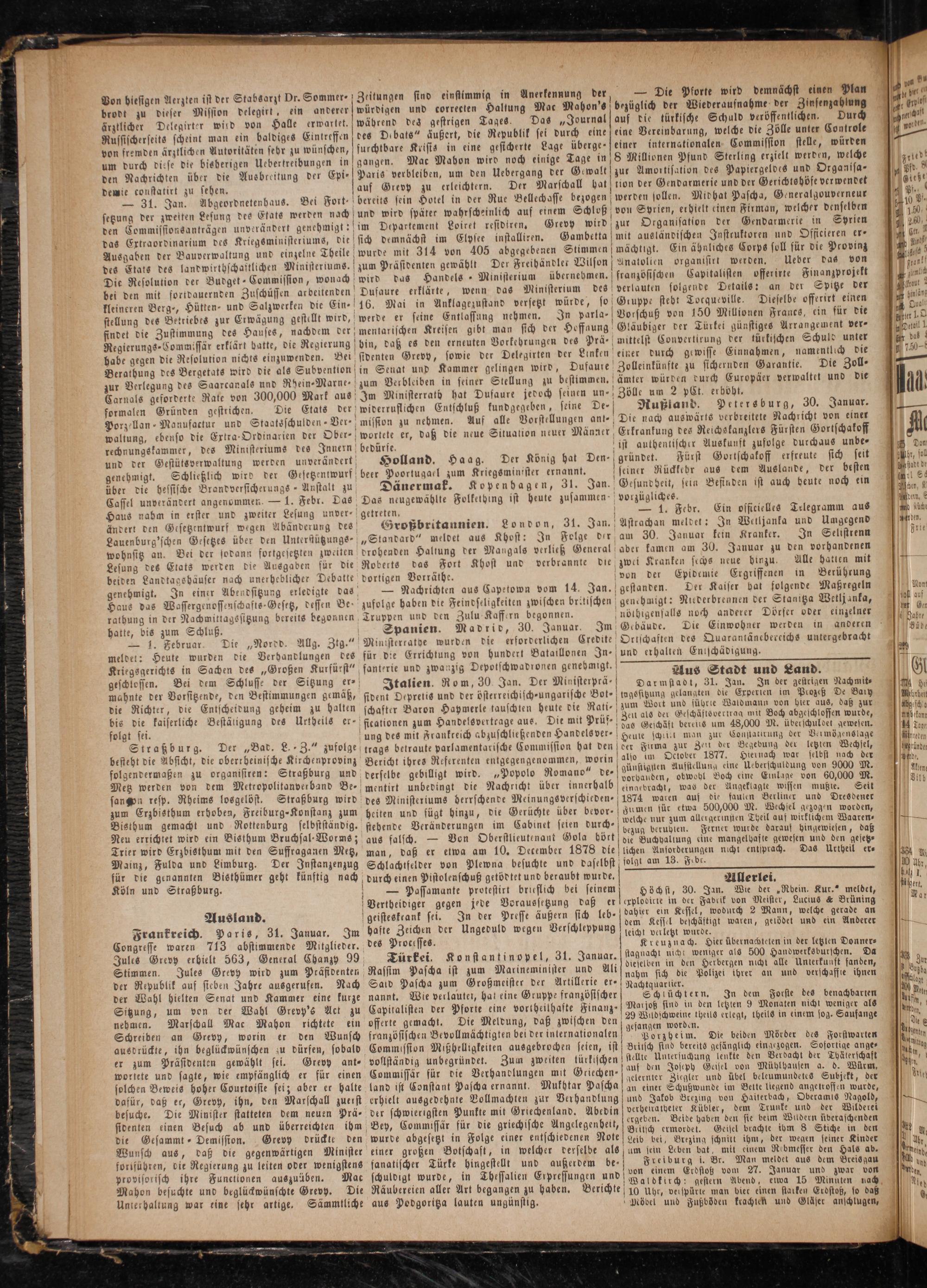 Frankreich. Paris, 31. Januar. Congresse waren 713 abstimmende Mitglieder. Jules Grevy erbielt 563, General Chanzwo 99 Türkei. Konstantinopel, 31. Januar. Stimmen. Jules Grevy wird zum Präfidenten Rassim Pascha ist zum Marineminister und Ali der Republik auf sieben Jahre ausgerufen. Nach Said Pascha zum Großmeister der Artillerie er- der Wahl hielten Senat und Kammer eine kurze nannt. Wie verlauter, hat eine Gruppe französischer Sitzung, um von der Wahl Grevp's Act zu Capitalisten der Pforte eine vortheilhafte Finanz- nehmen. Marschall Mae Mahon richtete ein offerte gemacht. Die Meldung, daß zwischen den Schreiben an Grevy, worin er den Wunsch französischen Bevollmächtigten bei der internationalen ausdrückte, ihn beglückwünschen zu dürfen, sobald Commission Mißhelligkeiten ausgebrochen seien, ist er zum Präsidenten gewählt sei. Grevy ant- voslständig unbegründet. Zum zweiten türklschen wortete und sagte, wie empfänglich er für einen Commissär für die Verhandlungen mit Griechen⸗ solchen Beweis hoher Courtoisie sei; aber er halte land ist Constant Pascha ernannt. Mukhtar Pascha dafür, daß ec, Grevy, ihn, den Marschall zuerst erhielt ausgedehnte Vollmachten zur Verhandlung besuche. Die Minister statteten dem neuen Prä- der schwierigsten Punkte mit Griechenland. Abedin sidenten einen Besuch ab und überreichten ihm Bey, Commissär für die griechische Angelegenheit, die Gesammt Demission. Grey drückte den wurde abgesetzt in Folge einer entschiedenen Note Wunsch aus, daß die gegenwärtigen Minister einer großen Botschaft, in welcher derselbe als fortführen, die Regierung zu leiten oder wenigstens fanatischer Türke hingestellt und außerdem be⸗ provisorisch ihte Functionen auszuüben. Mac schuldigt wurde, in Thessalien Erpressungen und Mahon besuchte und beglückwünschte Grevy. Die Räubereien aller Art begangen zu haben. Berichte Unterhaltung war eine sehr artige. Sämmtliche aus Podgoritza lauten ungünstig.