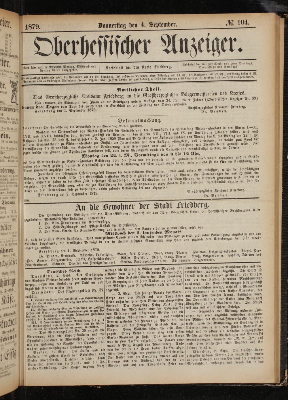 —. unen drei Tagen vom Tagt des Erscheinens im Kreisblatt an bei Meidung von Ordnungsstrasen. Friedberg den 1. September 1879. Großherzogliches Kreisamt Friedberg. Dr. Braden.