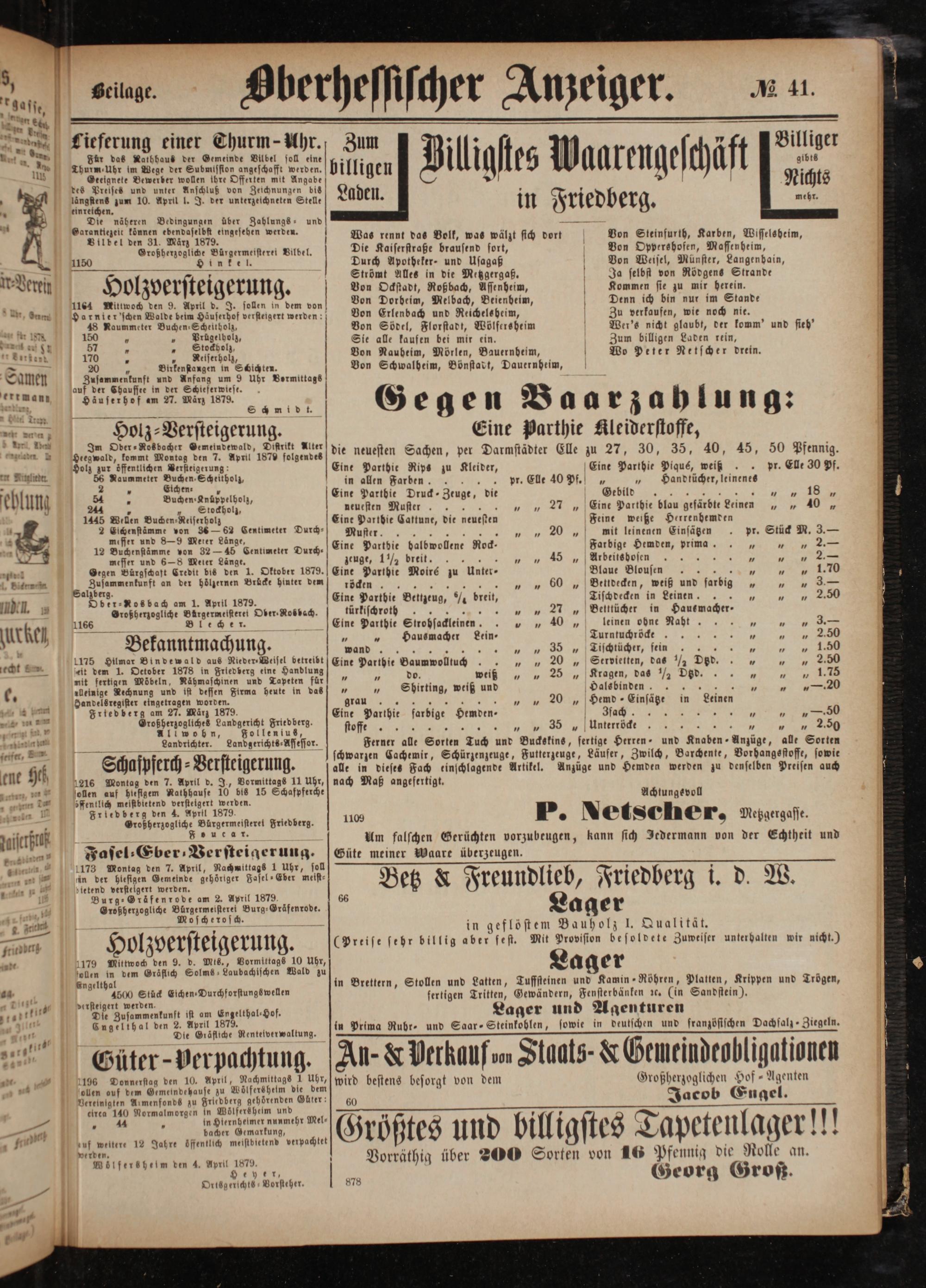 Bekanntmachung. 1175 Hümar Bindewald aus Nieder⸗Weisel betreibt eit dem 1. October 1878 in Friedberg eine Handlung nit fertigen Möbeln, Nähmaschinen und Tapeten für alleinige Rechnung und ist dessen Firma heute in das Handels register eingetragen worden.