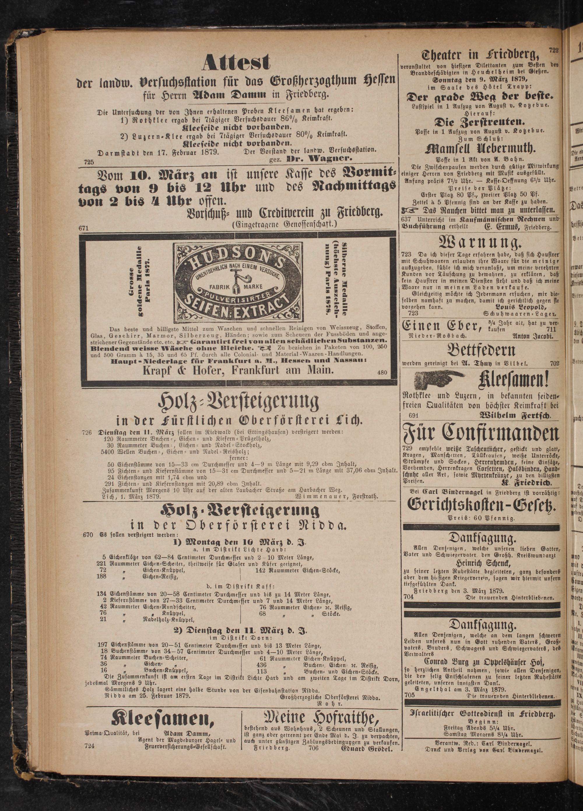 jedeßmal Morgens 9 Uhr. Sämmtliches Holz lagert eine halbe Stunde von der Eisenbahnstation Nidda. Nidda am 25. Februar 1879. Großherzogliche Oberförsterei Nidda. Ro h er.