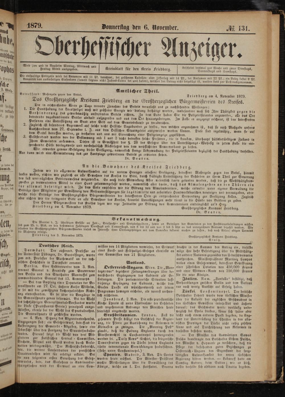 Amtlicher Theil. Betreffend: Maßregeln gegen den Bettel. Friedberg am 4. November 1879. Das Großherzogliche Kreisamt Friedberg an die Großherzoglichen Bürgermeistereien des Kreises.
