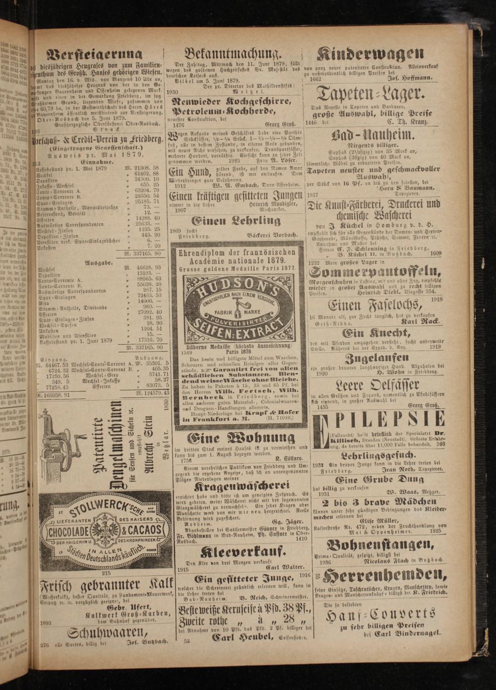 Wechse 5 f 0 5 Depostten Grosse goldene Medaille paris 1877 1 Conto⸗Corrente A. 2 Fonto⸗Corrente B. 5 1 Auswärtige Correspondenten b 5 Spar⸗Einlagen 5 Giro„ 14000.— 5 Stamm ⸗Antheile, Dividende 1 960.— D 3 Effecten„ 27092. 40 D MaRKE a 1 Spar⸗Einlagen⸗Zinsen 5 381. 95 6— 2 Wechsel⸗Spesen 5 18. 90 0 5 Unkosten N 1204. 51 2= 8 mug Mobilien und Utensilien 1 15.— 8 9 NM. 0 — Kassebestand pr. 1. Juni 1879 5 17316. 70 4— 1— 1 Wan. M. 337165. 90 Silberne Medaille höchste Auszeichnung test Ei. 1569 Paris 1878 Eingang. Ausgang. 9 5. i 8 c 1. 4 8 8 2 as beste d billigste Mittel z aschen, . 64467. 53 Wechsel⸗Conto-Corrent g. W. 35301. 5* 1 A N 5 n a icin N 5724 32 M ch leC nto⸗Corr t B 405 2 0 ern und schnelten 0 er Aller 10 1 an 17259. 56 8 190 91 15 e 5741.71 stände.„ Gurantirt frei von allen W. 0 cel kaff 1 1 25 schädlichen Substanzen. Bien- „ 71288 45 0 f„Inkasso* 83073. 5 dend weisse wäsche ohne Bleiche. —— 1 eee ffecten 3 Zu haben in Paketen à 15, 35 und 65 Pf. bei In bed en N. 166058. 91 M 12457973 den Herren 0 in. Fertseh, Wilh. 3299 IR ernbeek in Friedberg, bei — 5 — 88 allen anderen guten Material-; Colonialwaaren- — 2— und Droguen- Handlungen allerorts. l —— 5 3 Haupt-Niederlage bei Krapf Hofer —— 2— in Frankfurt a. M. II. 1— 2— —— 9—„ . ˖ Woh =„ Eine Wohnung 28 2 5 g 5 2 —— 2— im dritten Stock meines Hauses ist zu vermiethen und —— 2— kann bis zum 1. August bezogen werden. J ö 2—— 1756 28 K. Söllner. — 4. 2 0— Einem verehrlichen Publikum von Friedberg und Um — 2 gegend die ergebene Anzeige, daß ich an untengenannten o Plätzen Niederlagen meiner 2 2 8 Kragenwäscherei