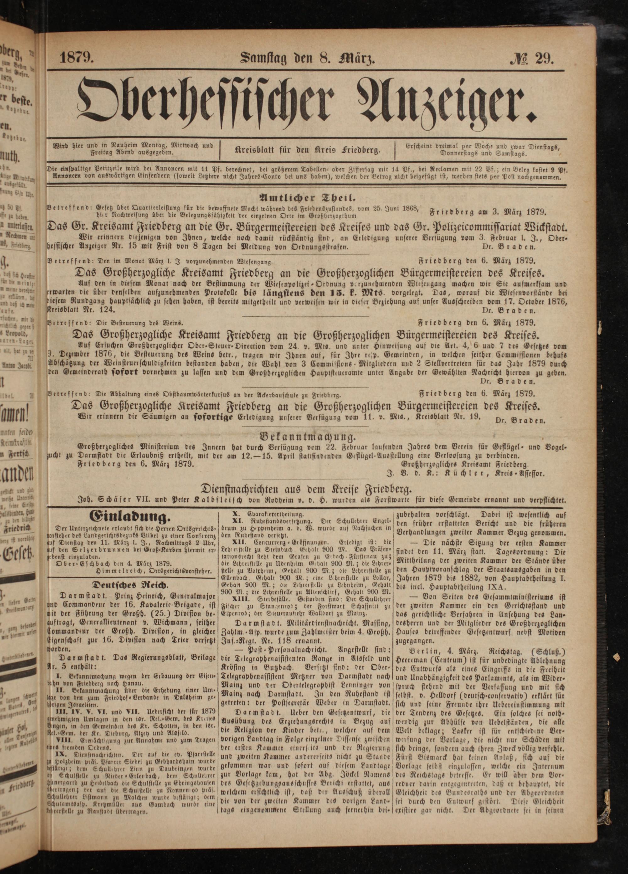 1 Dr. Braden. 5 Betreffend: Die Abbaltung eines Obstbaumwärterkursus an der Ackerbauschule zu Friedberg. Friedberg den 6. März 1879. 7 Das Großherzogliche Kreisamt Friedberg an die Großherzoglichen Bürgermeistereien des Kreises. Unen! Wir erinnern die Säumigen an sofortige Erledigung unserer Verfügung vom 11. v. Mis., Kreisblatt Nr. 19.. Aten seide d 5 i Bekanntmachung. a 8— Großherzogliches Ministerium des Innern hat durch Verfügung vom 22. Februar laufenden Jahres dem Verein für Geflügel- und Vogel- n Fertsa jucht zu Darmstadt die Erlaubniß ertheilt, mit der am 12.— 15. April stattfindenden Geflügel-Ausstellung eine Verloosung zu verbinden. Friedberg den 6. März 1879. Großherzogliches Kreisamt Friedberg J. V. d. K.: Küchler, Kreis- Assessor. Dienstnachrichten aus dem Kreise Friedberg. Joh. Schäfer VII. und Peter Kalbfleisch von Rodbeim v. d. H. wurden als Forstwarte für diese Gemeinde ernannt und verpflichtet. r Cestz Iden 3 X. Cbataklierertheilung. ubehalten vorschlägt. Dabei ist wesentlich auf 1 den 1 Einladung. XI. Rubestandeversetzung. Der Schullebrer Angel- den srüber erstatteten Bericht und die früheren zriedti Der Unterzeichnete erlaubt sich die Herren Ortsgerichts-[drum zu Heppendeim a. d. W. wurde auf Nachsuchen in g 5„ wisteher des Landgerichts bezuks Vilbel zu einer Conferenz den Rubestand versetzt. J Verhandlungen zweiter Kammer Bezug genommen. ur N rere zuf Dienstag den 11. März l. J., Nachmittags 2 Ubr, XII. Concurrenz⸗Eröffnungen. Erledigt it: die— Die nächste Sitzung der ersten Kammer Geseb 1— 1 bei Groß⸗Karben hiermit er⸗ ee 9 9 75 2. We- sindet den 11. März statt. Tagesordnung: Die a 7 cbenst einzuladen. sonsre e em Grafen zu Erbach Fücstene zu z g 1*— 2 „ febereeschbach den 4. Nän 1879. die Letrerstelle zu Udendem Gball 900 M. z die Lehrer. Mittheilung der zweiten Kammer der Stände über a l Himmelreich, Ortsgerichtsvorsteher. stelle zu Volxbeim, Gebalt 900 M.; die Lehrersielle zu den Hauptvoranschlag der Staatsausgaben in den —— Eüenbach Gebalt 900 M.; eine Lebrerstelle zu Lollar, Jahren 1879 bis 1882, von Hauptabtheilung I. Deutsches Reich. Gehan 900 M.; die Lehrerstelle zu Lebnbeim, Gehalt] bis incl. Hauptabtheilung IX A. f D g 885 900 M.; die Lehretstelle zu Altenschlirf, Gehalt 900 M.“ Vo⸗ 3 560 18 4 3 armstadt. Prinz Heinrich, Generalmajor XIII. Sberbesälle. Gestorben sind: Der Schullehrer— Von Seiten des Gesammtministeriums ist 5 een ind Commandeur der 16. Kavalerie Brigade, ist Fischer zu Stangenrod; der Forstwart Schasfniit zuf der zweiten Kammer ein den Gerichtsstand und 3 tit der Führung der Großh.(25.) Division be- Elpenrod; der Steueraufsehr Walldorf zu Mainz. das gerichtliche Verfahren in Ansehung des Lan— e auftragt, Generallieutenant v. Wichmann, seither Darmstadt. Militärdienstnachricht. Massing, desherrn und der Mitglieder des Großherzoglichen 1 0* i en ö n. te zog nn ommandeur der Großh. Division, in gleicher Zahlm.-Asp. wurde zum Zahlmeister beim 4. Großh.] Hauses betreffender Gesetzentwurf nebst Motiven n FGigenschaft zur 16. Division nach Trier versetzt Inf.-Regt. Nr. 118 ernannt. zugegangen. , dorden. f f E Post- Personalnachricht. Angestellt sind: Berlin, 4. März. Reichstag.(Schluß.) DdDarmstadt. Das Regierungeblatt, Beilage die Telegrapbenassistenten Range in Alsfeld und Heereman(Centrum) ist für unbedingte Ablehnung Jr. 5 enthält: Krösing in Butzbach. Versetzt sind: der Ober- des Entwurfs als eines Eingriffs in die Freiheit —— I. Bekanntmachung wegen der Erbauung der Elsen⸗ Telegrapbenassistent Metzner von Darmstadt nachs und Unabbängigkeit des Parlaments, als im Wider- tehn von Friedberg nach Hanau. Mainz und der Obertelegrophist Lenninger von spruch stehend mit der Verfass d mit sich 1 ee 5 Wr f f be f assung und mit ft. . be 1 dae Sestri le g. Mainz nach Darmstadt. In den Rughestand 0 seloß. v. Helldorf(deutsch-conservativ) erklärt für g—* Arigen Jeraelilen. getreten: der Postsetretärx Weber in Darmstadt.sich und seine Freunde ihre Uebereinstimmung mit eee, II. IV. v. VI. und VII. Uebersicht der für 1879 Darmstadt. Ueber den Gesetzentwurf, diefder Tendenz des Gesetzes. Eln solches sei noth⸗ 1 i nn**** 5 3 Ausübung des Erziehungsrechts in Bezug aufwendig zur Abhülfe von Uebelständen, die alle 1 1 9 ö„ ů AN ann, de uns Aleseld. die Religion der Kinder beten, welcher auf dem Welt beklage; Lasker ist für entschtedene Ver- 0 e, III. Cimächugung zur Annahme und zum Tragen vorigen Landtag in Folge einzelner Dissense zwischen werfung der Vorlage, die nicht nur Schäden mit 126 E chligung z 5 0 g 9 b 1 18 tires fremden Ordens. der ersten Kammer einerseits und der Regierung sich bringe, sondern auch ihren Zweck völlig verfehle. 0 enn 55 3 Aleuud. und zweiten Kammer andererseits nicht zu Stande Fürst Bismarck hat keinen Anlaß, sich auf die —k L* 75 1 wurde gekommen war und sofort auf diesem Landtage Vorlage selbst einzulassen, welche ein Internum