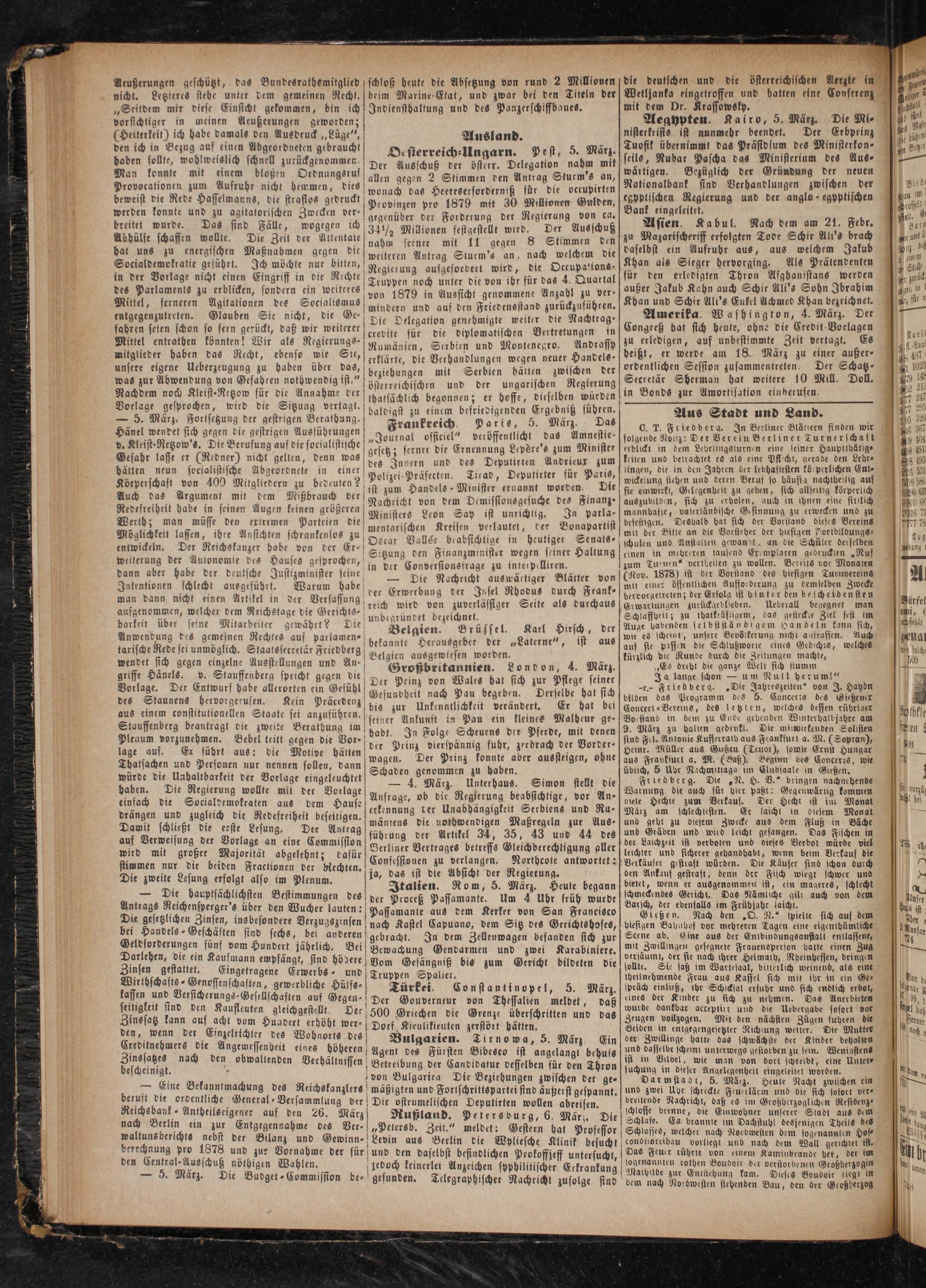 — 4. März. Unterhaus. Simon stellt die Anfrage, ob die Regierung beabsichtige, vor An- erkennung der Unabhängigkeit Serbiens und Ru- mäntens die nothwendigen Maßregeln zur Aus- führung der Artikel 34, 35, 43 und 44 des Berliner Vertrages betreffs Gleich berechtigung aller Confessionen zu verlangen. Northeote antwortet: ja, das ist die Absicht der Regierung.