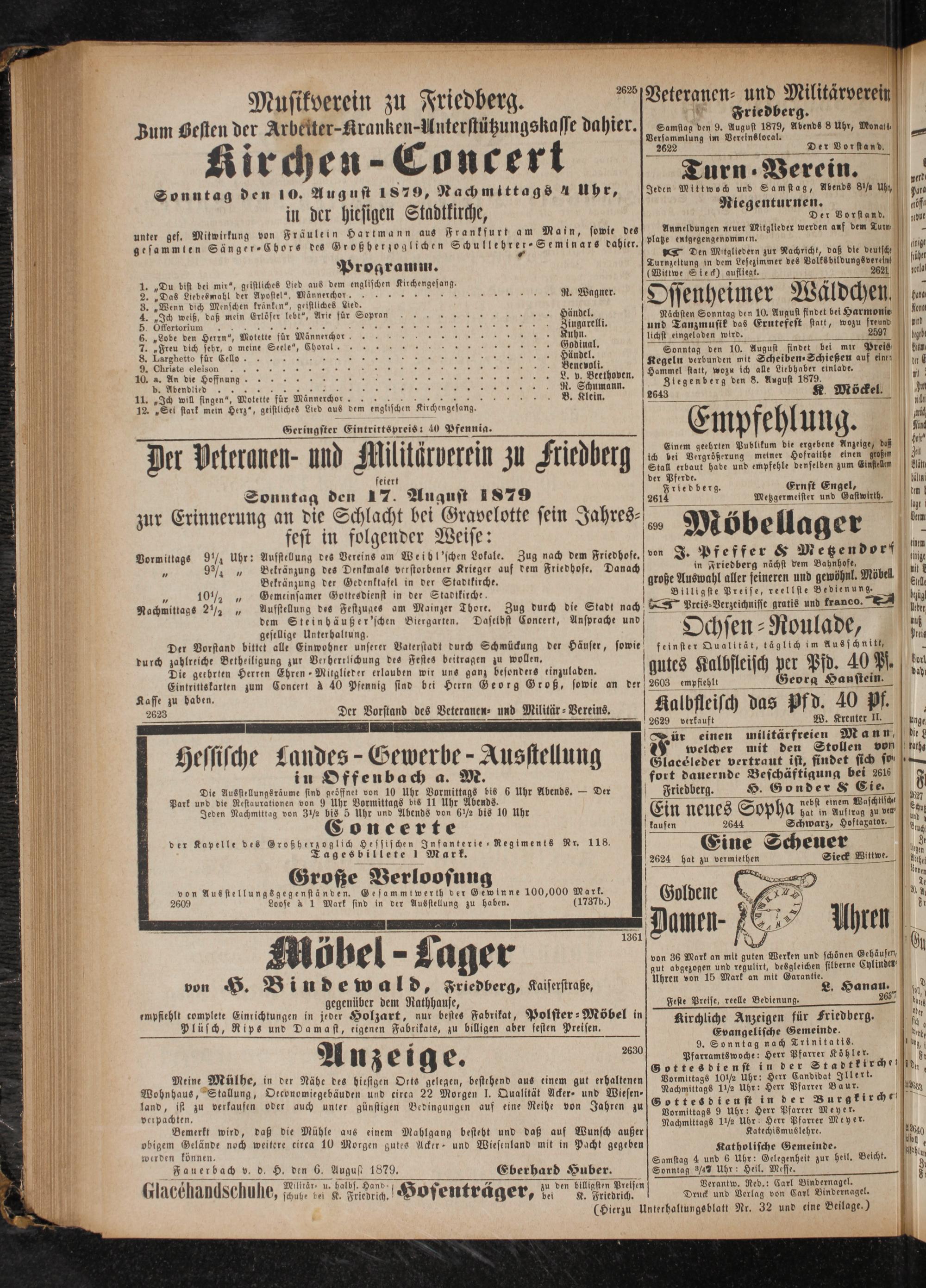 Sonntag den 17. August 1879 zur Erinnerung an die Schlacht bei Gravelotte sein Jahres⸗ fest in folgender Weise: Uhr: Aufstellung des Vereins am Weib l'schen Lokale. Zug nach dem Friedhofe. Bekränzung des Denkmals verstorbener Krieger auf dem Friedhofe. Danach Bekränzung der Gedenktafel in der Stadtkirche. Gemeinsamer Gottesdienst in der Stadtkirche. Aufstellung des Festzuges am Mainzer Thore. Zug durch die Stadt nach dem Steinhäußer'schen Biergarten. Daselbst Concert, Ansprache und gesellige Unterhaltung. Der Vorstand bittet alle Einwohner unserer Vaterstadt durch Schmückung der Häuser, sowie durch zahlreiche Betheiligung zur Verherrlichung des Festes beitragen zu wollen. Die geebrten Herren Ehren-Mitglieder erlauben wir uns ganz besonders einzuladen. Eintrittskarten zum Concert à 40 Pfennig sind bei Herrn Georg Groß, sowie an der Kasse zu haben. 2623