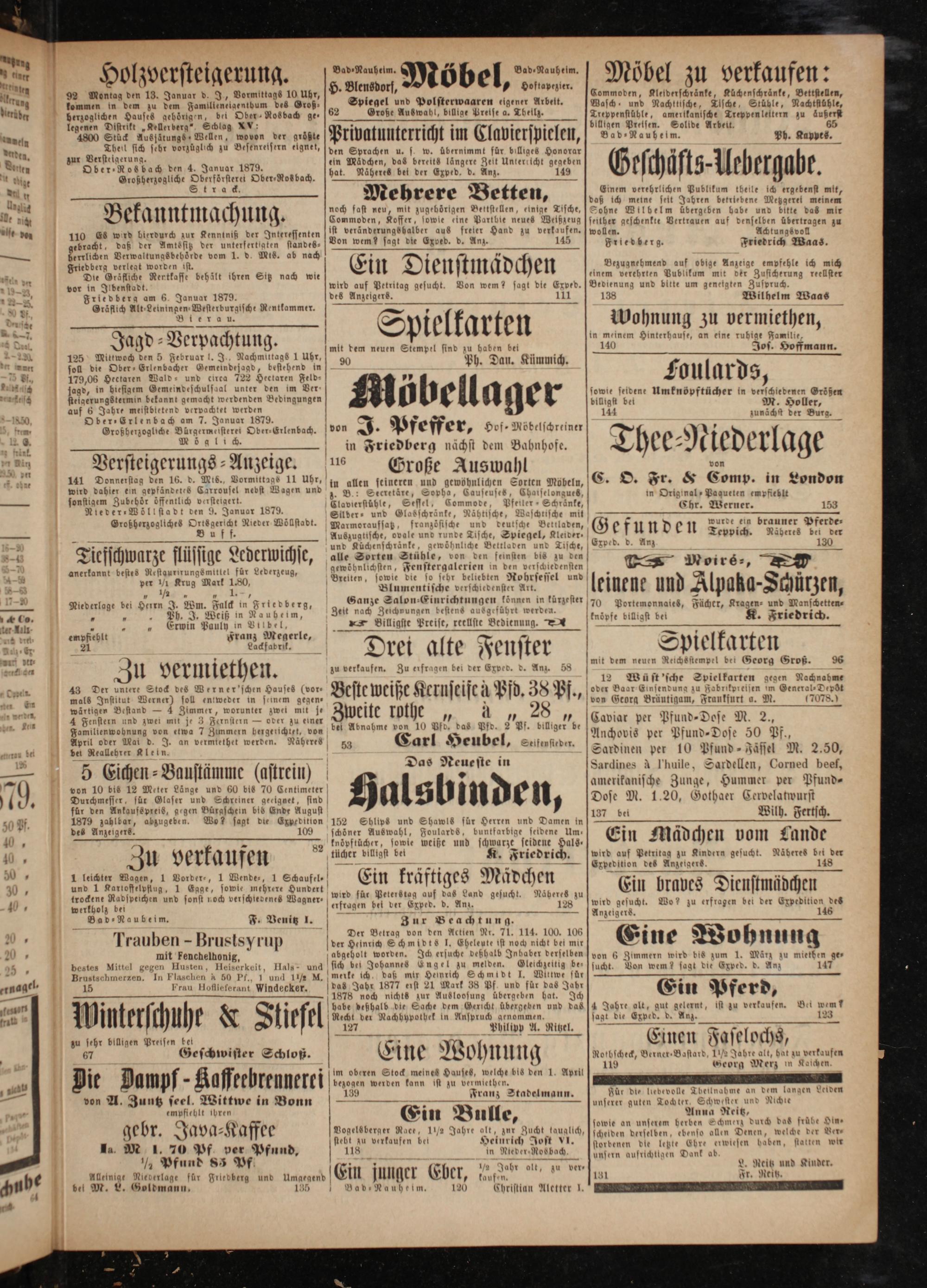 Einem verehrlichen Publikum theile ich ergebenst mit, daß ich meine seit Jahren betriebene Metzgerei meinem Sohne Wilbelm übergeben habe und bitte das mir seither geschenkte Vertrauen auf denselben übertragen zu wollen. Achtungs voll Friedberg. Friedrich Waas.