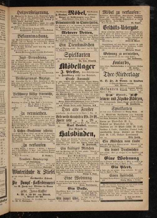 noch fast neu, mit zugehorigen Bettstellen, einige Tische, Commoden, Koffer, sowie eine Parthie neues Weißzeug ist veränderungshalber aus freier Hand zu verkaufen. Von wem? sagt die Exved. d. Anz. 145