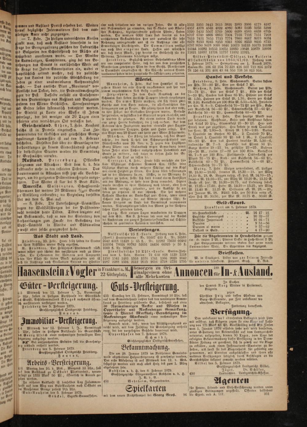 Bei entsprechenden Geboten soll die Genehmig— ug alsbald ertheilt werden. Friedberg den 5. Februar 1879. Großherzogliches Ortsgericht Friedberg. Fouca r.
