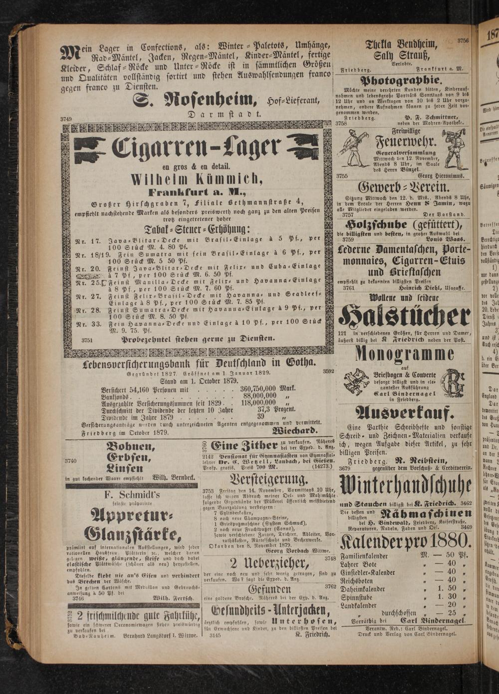 Gegründet 1827. Eröffnet am 1. Januar 1829. Stand am 1. October 1879. Versichert 54,160 Personen mit FF Ausgezahlte Versicherungssummen seit 1829. Durchschnitt der Dividende der letzten 10 Jahre Dividende im Jahre 1879 e 7 Versicherungsanträge werden durch unterzeichneten Agenten entgegenommen und vermittelt.