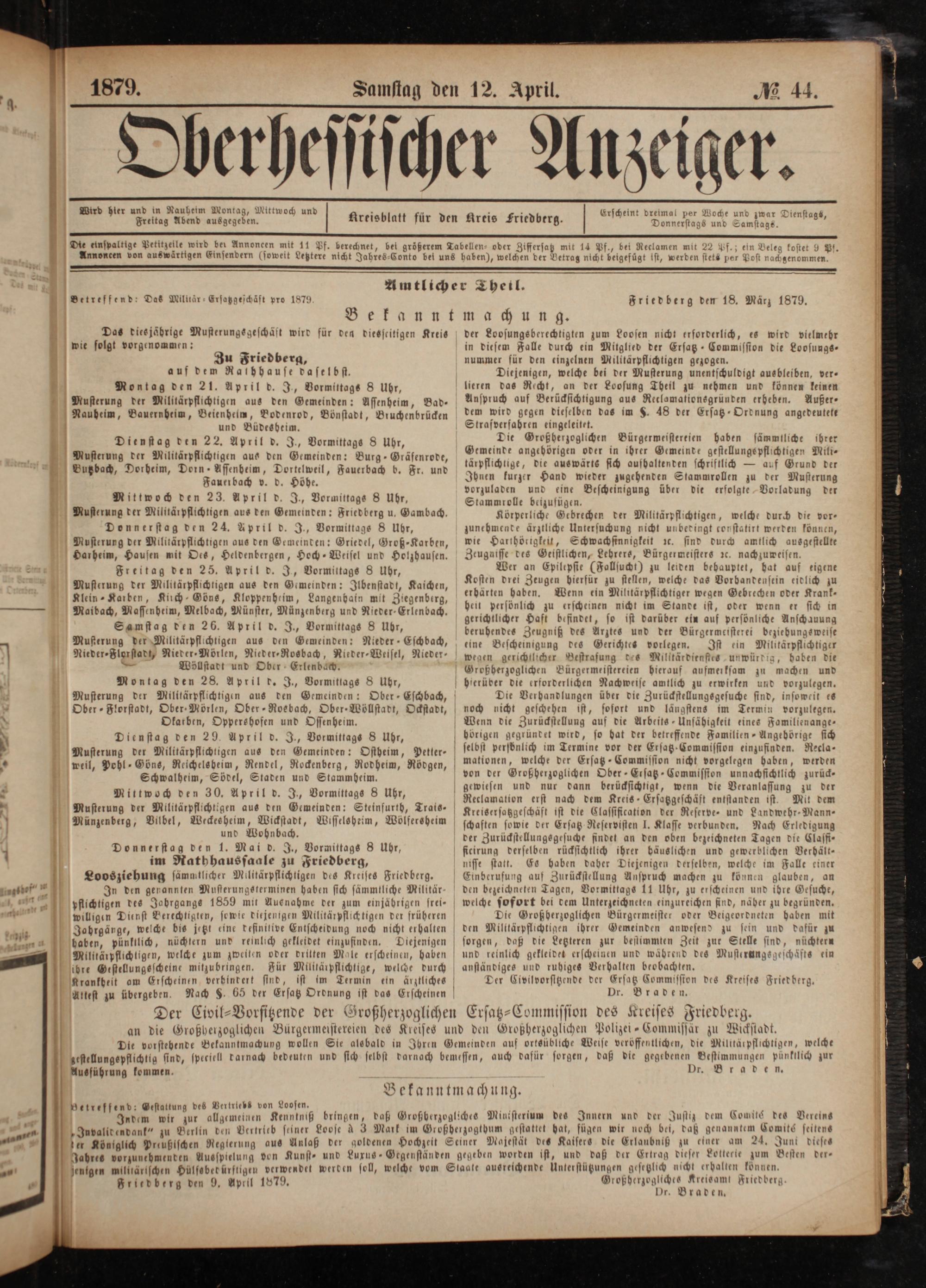 Fautrbach v. d. Höhe. Mittwoch den 23. April d. J., Vormittags 8 Uhr, Musterung der Militärpflichtigen aus den Gemeinden: Friedberg u. Gambach. Donnerstag den 24. April d. J., Vormittags 8 Uhr, Musterung der Militärpflichtigen aus den Gemeinden: Griedel, Groß-Karben, Harheim, Hausen mit Oes, Heldenbergen, Hoch-Weisel und Holzhausen.