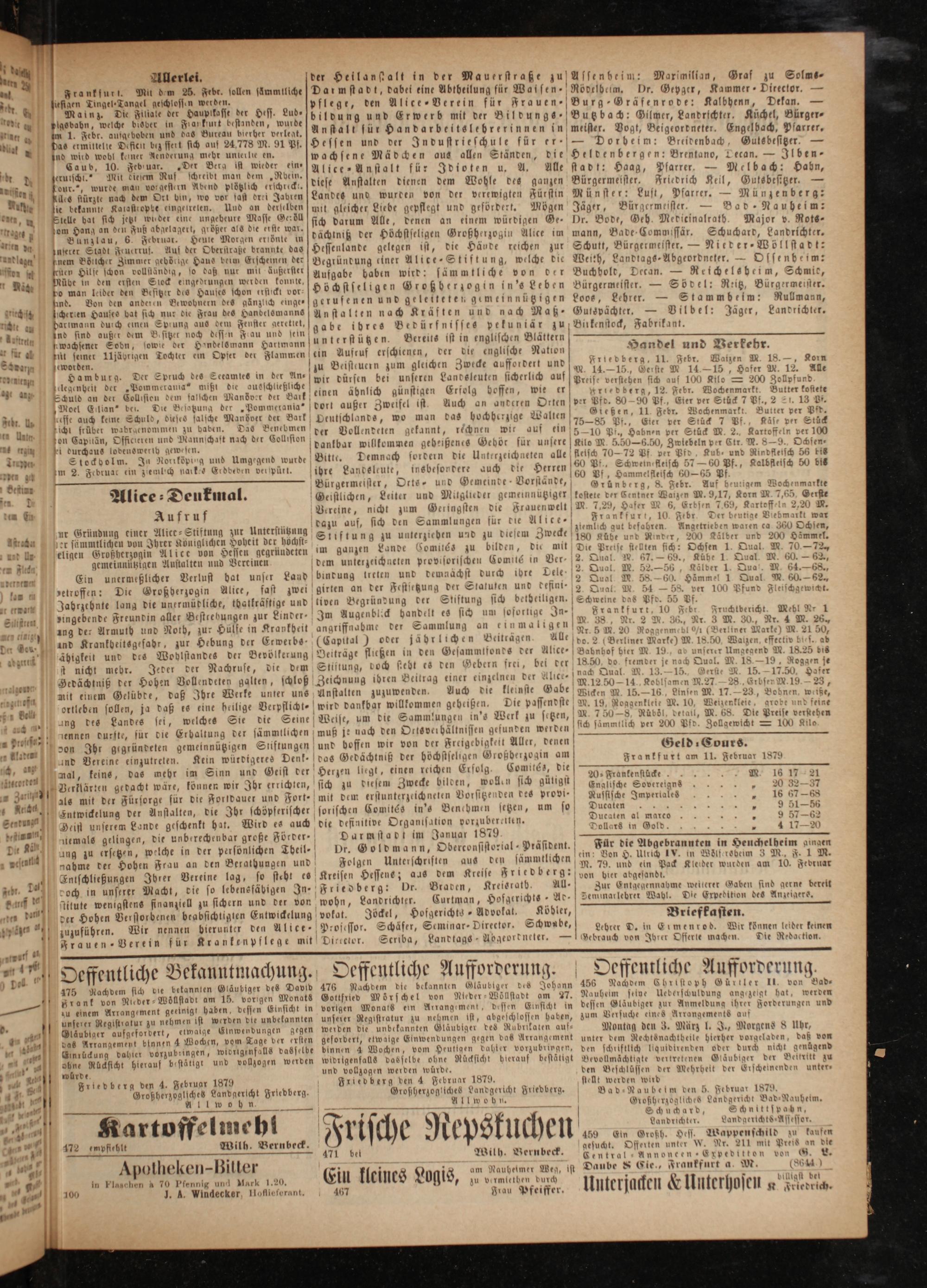 Febt. 10 doch in unserer Macht, die so lebensfäbigen In- Friedberg: Dr. Braden, Kreisratb. All.“ Zur Entgegennahme weiterer Gaben sind gerne dereit kauf ie Aitute wenigstens finanziell zu sichern und der von wohn, Landrichter. Curtman, Hofgerichte Ad. See Wabl. Die Expedition des Anzeigers. n 47 der Hohen Verslorbenen beabsichtigten Entwickelung vokat. Jöckel, Hofgerichts„ Advokat, Ködler, Briefkasten. Wan zuzuführen. Wir nennen bierunter den Alice Professor. Schäffer, Seminar-Director. Schwabe, Lehrer D. in Ermenrod. Wir können leider keinen Frauen- Verein für Krankenpflege mit Dircetor. Seriba, Landtags- Abgeordneter.—(Gebrauch von Ihrer Osserte machen Die Redaction. re 2 7 1* 1 N W450 o 4* 98 2**—. 1 0 % Oeffentliche Bekanntmachung. Oeffentliche Aufforderung. Oeffentliche Aufforderung, f 175 Nachdem sich die bekannten Gläubiger des David 476 Nachdem die bekannten Gläubiger des Johann 456 Nachdem Chrtstoph Gürtler II. von Bad⸗ Frank von Nieder-Wöllstabdt am 15. vorigen Monats Gottfried Mörschel von Nieder Wöllstadt am 77. Nauheim seine Ueberschuldung angezeigt hat, werden — zu einem Arrangement geeinigt haben, dessen Einsicht in vorigen Monats ein Arrangement, d ssen Einsicht in dessen Gläubiger zur Anmeldung ihrer Forderungen und 0 unserer Registratur zu nehmen ist werden die unbekannten unserer Registratur zu netzmen ist, abgeschlossen haben, zum Versuche eines Arrangements auf 1 Oläubiger aufgefordert, etwaige Einwendungen gegen werden die unbekannten Gläubiger des Rubrikaten auf Montag den 3. Mürz l. J., Morgens 8 Uhr, 4. das Arrangement binnen 4 Wochen, vom Tage der ersten gefordert, etwaige Einwendungen gegen das Arrangement unter dem Rechtsnachtheile hierher vorgeladen, daß von . ee Einrückung dahler vorzubringen, widrigenfalls dasselbe binnen 4 Wochen, vom Heullgen dahter vorzubripgen, den schriftlich liguidirenden oder durch nicht genügend Jr ohne Rücdlsicht hierauf bestätigt und vollzogen werden widrigenfalls dasselbe ohne Rücksicht hierauf bestaͤtigt Bevollmächtigte vertretenen Gläubiger der Beiterltt zu z Ke würde. und vollzogen werden würde.. den Beschlüssen der Mehrheit der Erscheinenden unter— ee Friedberg den 4. Februar 1879 Friedberg den 4 Februar 1879. stellt werden wird c 8 Großherzoglsches Landgericht Friedberg. Großherzogliches Landgericht Friedberg. Bad ⸗Naubeim den 5. Februar 1879. 120 All weao hen. Allwohn. 5 Großherzogliches Landgericht Bad⸗Naubelm. * N. 0 5 8 7 N X*„F Schuchard, Schnittspabn, 0 10 Kartoffelmehl 3 rt d E 9 0 Skuch en Landrichter. Landgerichts-Assessor. k** 11 7 0* 459 Ein Großh. Hess. Wappenschild zu kaufen 7% 172 empfiehlt Wilh. Bernbeck. Gt. Offerten unter W. Nr. 211 mit Preis an dle un 471 bet Wilh. Bernbeck. gesucht. fferten u e Nr. 2 reis an a e A 1 5 Biller Central Annoncen Expeditton von G v. * 50 en Ei ll f 8 L 18. Nauhelmer Weg, ist Daube 8 Cie., Frankfurt a. M.(8644) * 6 in Flaschen à 70 Pfennig und Mark 1.20. 0 Ill cines ugs, zu vermiethen durch 1 teri ken* Unt Tü sen billigst bet 8 1 100 J. A. Windecker, Hoflieferant. 467 Frau Pfeiffer. U U 0 1 c 0 K Friedrich. ** 8