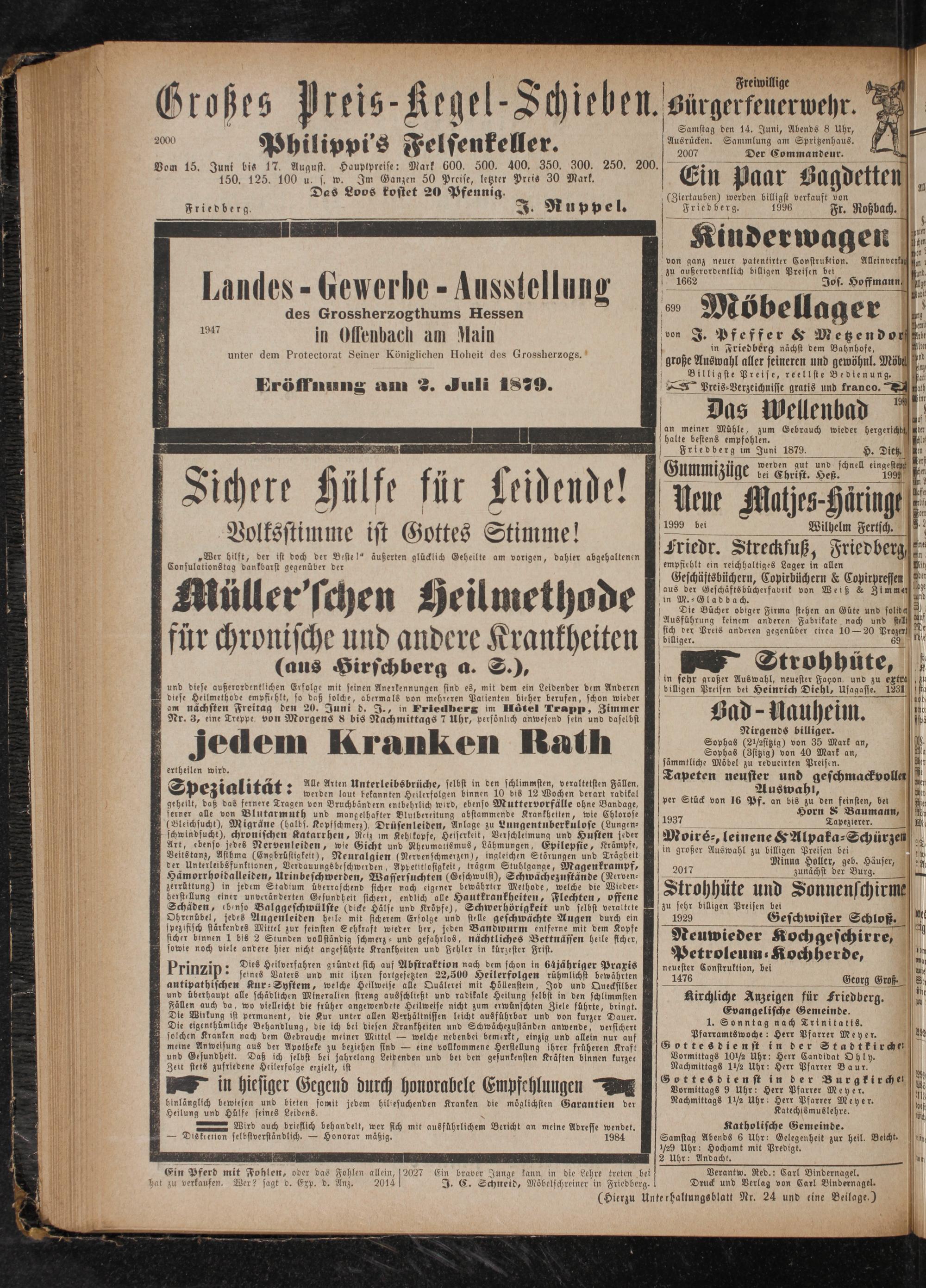 und diese außerordentlichen Erfolge mit seinen Anerkennungen sind es, mit dem ein Leidender dem Anderen diese Heilmethode empfiehlt, so daß solche, abermals von mehreren Patienten bieher berufen, schon wieder am nächsten Freitag den 20. Juni d. J., in Friedberg im Hôtel Trapp, Zimmer Nr. 3, eine Treppe von Morgens 8 bis Nachmittags 7 Uhr, persönlich anwesend sein und daselbst