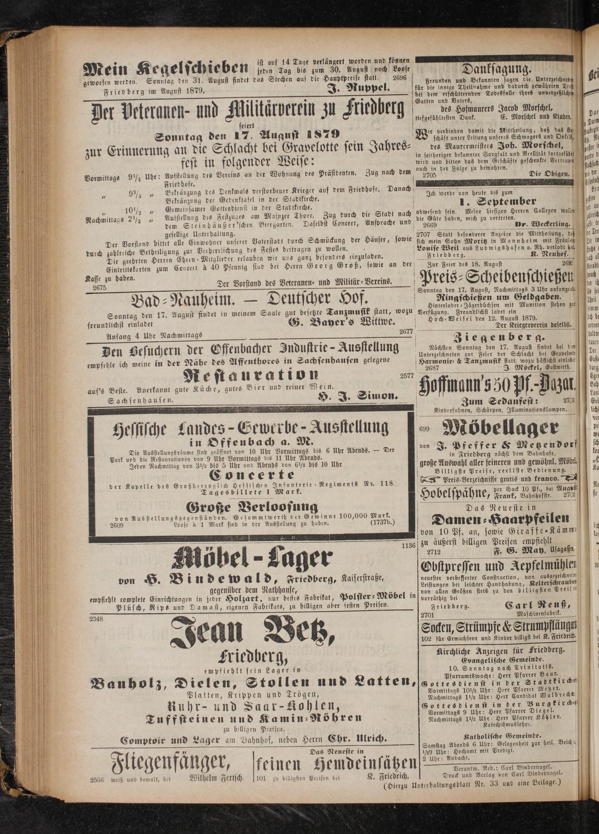 geworfen werden. Sonnsag den 31. August findet das Stechen auf die Hauptpreise statt, Friedberg im August 1879. J. Ruppel.
