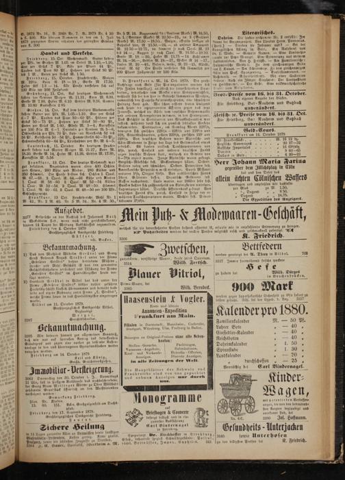 1 Annoncen Expedition eit el, 5 5 2 r A er. Wrankfurt am Main. —— a 7 77 f lie 0 1 8— 8 R 1 ach un Filialen in Darmstadt, Mannheim, Carlsruhe, Familienkalender M. 5⁰ Pf. E ann m U U. Stuttgart, Würzburg, Ulm, Freiburg in Baden. Lahrer Bote 5 40 1 3395 Wir bringen lernt zur allgemeinen Kenntriß, 5 Einsiedler-Kalender„— 40, daß wir nur auf speciellen Antrag des betreffenden] Besorgen zu Original-Preisen ohne alle Neben- Reichsboten— 40 Gläubigers und gegen eine vorher zu leistende Kosten⸗ Pansen 8 f f vorlage in den uns übertragenen Executionssachen weiter Stellen- Gesuche, Pachtungen, Daheimkalender* 1. 50 verde. Vacnnzen- Angebote, Submissionen, Spi 0 Fatberg am 14. October 1879. Kauf- und Verkaufs- Heiraths- Offerten, Spinnstube 8 1. 30 5 Keil und König, Anzeigen. Discrete Anzeigen. f Landkalender 1 20 1 „ Gerichtsvollzieher. elt. e Großb. Gerichts vollzicher im alle Zeitungen der Welt l durchschosen„— 25„