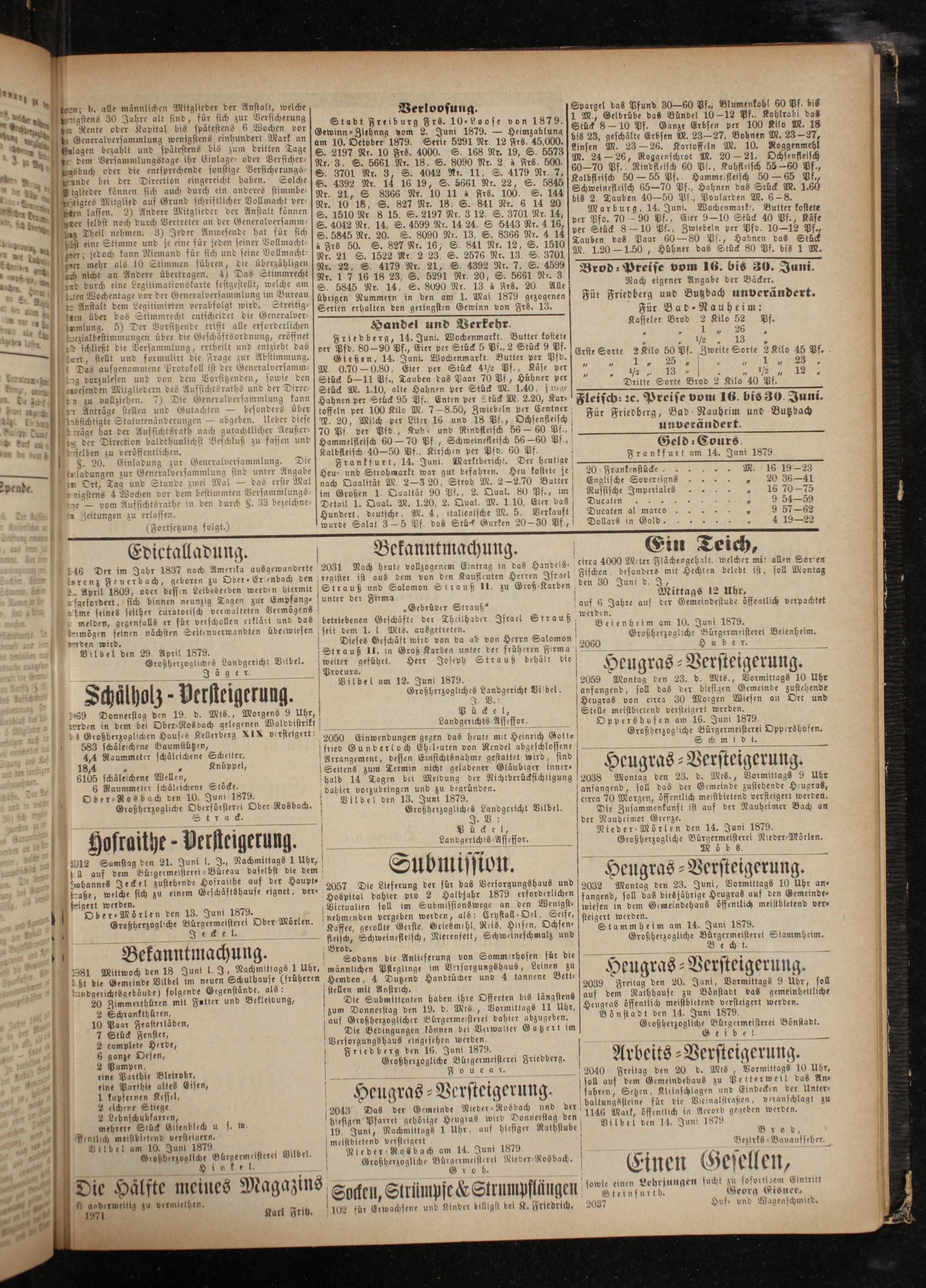 Brod⸗Preise vom 16. bis 30. Juni. Nach eigener Angabe der Bäcker. Für Friedberg und Butzbach unverändert. Für Bad⸗Nauheim: Kasseler Brod 2 Kilo 52 Pf. „* 1 7 26 . 8 Erste Sorte 2 Kilo 50 Pf. Zweite Sorte 2 Kilo 45 Pf. „ 25„ 1 r %% s„„ Dritte Sorte Brod 2 Kilo 40 Pf. Fleisch⸗ ꝛc. Preise vom 16. bis 30. Juni. Für Friedberg, Bad Nauheim und Butzbach unverändert. Geld⸗Cours Frankfurt am 14. Juni 1879 20 ⸗Frankenstücke. M. 16 19—23 Englische Sovereighns* 20 36—41 Russische Imperiales 16 70—75 Ducaten 5 9 54—59