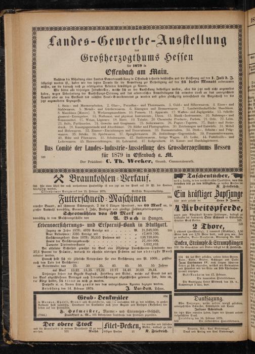 Nachdem die Abhaltung einer Landes- Gewerbeausstellung in Offenbach definitiv beschlossen und die Eröffnung auf den J. Juli d. J. sestgesetzt worden ist, haben wir den letzten Termin für die Anmeldung zur Betheiligung auf den 28. dieses Monats anberaumen müßsen, um die darnach noch zu erledigenden Arbeiten bewältigen zu können.