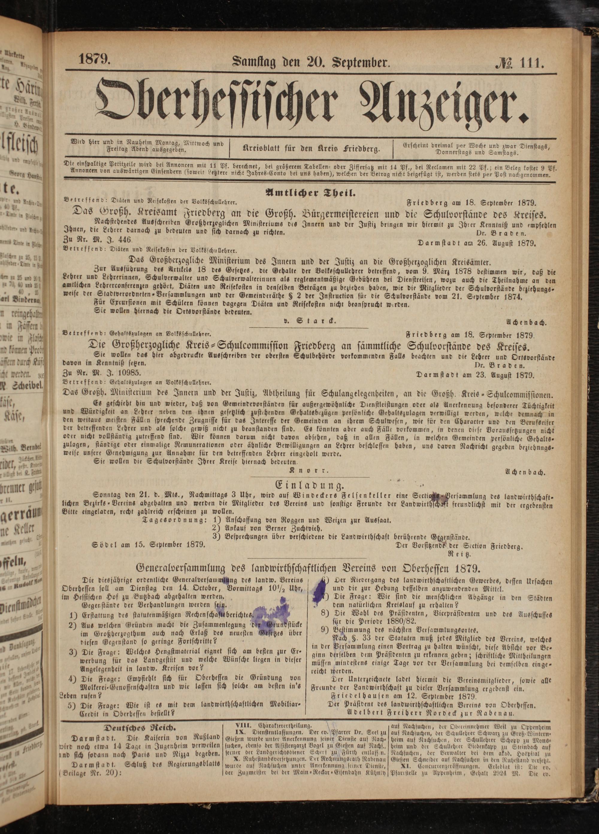 Betreffend: Diäten und Reisekosten der Volksschullehrer. Friedberg am 18. September 1879.
