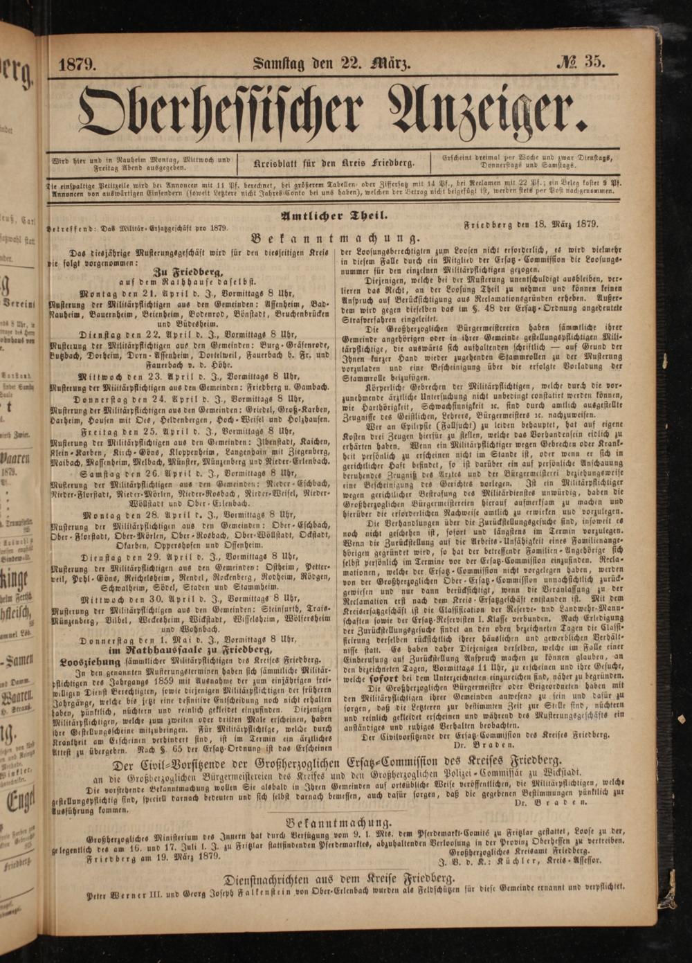 und reinlich gekleidet erscheinen und während des Musterungsgeschafts ein anständiges und ruhiges Verhalten beobachten. Der Civilvorsitzende der Ersatz Commission des Kreises Friedberg. Dr. Braden.
