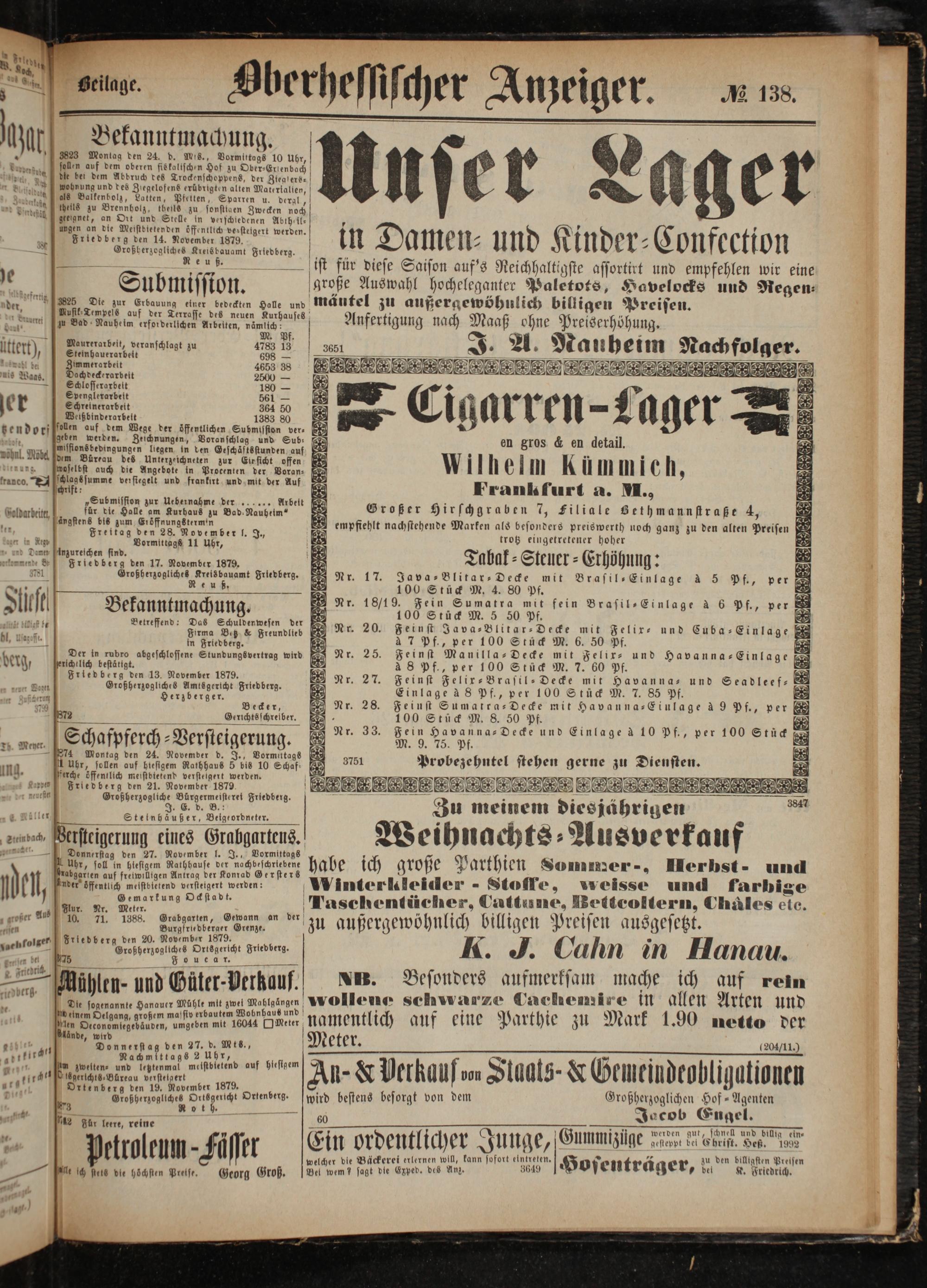 ungen an die Meistbietenden öffentlich versteligert werden. Friedberg den 14. November 1879.