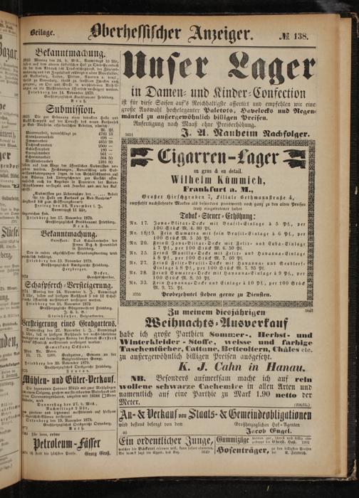 Frtedberg den 13. November 1879. Feinst Felix⸗Brasil⸗Decke mit Havanna- und Seadleef- e bun:.. Einlage a8 pf, per 100 Stück M. 7. 85 Pf. 8 * 1 Becker, Feiust Sumatra⸗Decke mit Havanna-⸗Eiulage à 9 Pf., per E 4 8¹² Gerichts schrelber. 100 Stück M. 8. 50 Pf. 0 p 99 E 9 5 3 Fein Havanna-Decke und Einlage à 10 Pf., per 1 t ü ck „ Schafpferch⸗Versteigerung.. d. 28, 5. 5 .— t November d.„Vormittags 1 f ing U uhr, sollen auf hiestgem Nathhaus 5 bis 10 Schef. Probezehntel stehen gerne zu Diensten. 4. ferche 8 lich meistbietend verstelgert werden. 8 5 N N N Neid eg bn 21. Metaler lb.% eee eee t reuesis Großherzogliche Bürgermeisteret Friedberg. T 5 8 5 2 eee Zu meinem diesjährigen Allet Steilnhäußer, Beigkordneter.