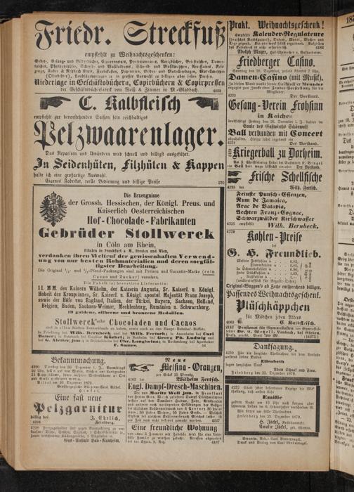 sind in allen Städten Deutschlands zu haben, sowie auch an den Haupt- Bahnhof- Büffets. In Friedberg bei Wilh. Rernbecrk und bei Wilh. Fertsenh; in Assenheim bei Carl Bauer; in Butzbach bei Conditor Küchsel; in Nauheim bei Georg Ph. Ludwig und bei G. Aletter, Jun,; in Reichelsheim bei Chr. Langheinz; in Rockenberg bei Apotheker F. Sames. 56