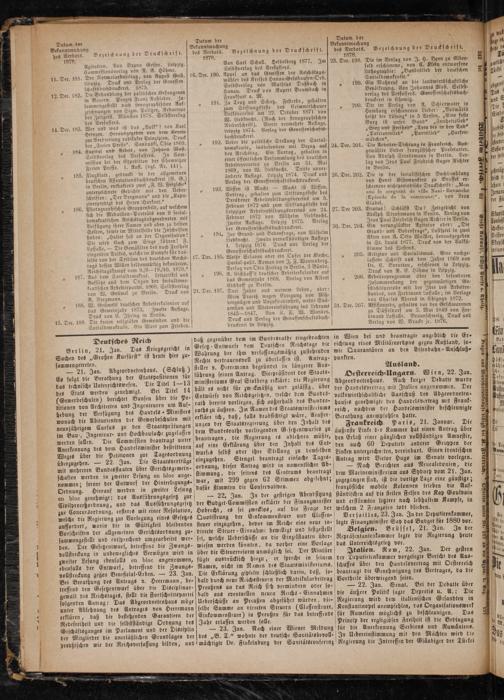 Datum der e 45 1 e 1 9 0 7 ung ekanntmachung ekanntmachung 1 1 8 Bezeichnung der Druckschrift. des 8 Bezeichnung der Druckschrift.] des. Bezeichnung der Druckschrift.“ 78 818.. * Agitation. Von Bruno Geiser. Leipzig. Von Carl Scholl. Heidelberg 1877. Im] 23. Dee. 198. Die im Verlag von J. H. Born zu Elber⸗ Commissionsverlag von R. E. Höhme. Selbstverlag des Verfassers. a feld erschienene, von C. Klein entworfene 11. Dec. 181. Der Normalarbeitstag, von August Geib. 16. Dee. 190. Appel an das Gewissen der Reichstags⸗ Lithographie: Bundeslied der deutschen Leipzig. Druck und Verlag der Genossen— wähler des Kreises Hanau-Gelnhausen-Orb. Soeialdemokratie. i g schaftsbuchdruckerei. 1875. Selbstverlag von Mathias Daßbach in 10 199. Ein Mahnruf an ie landwirthschaftliche 12. Dee. 182. Die Behandlung der politischen Gefangenen Hanau. Druck von Rupert Baumbach in Bevölkerung. Von Johannes Most. Selbst⸗ 2 in Bayern. Prozeß Franz Rohleder. Zu⸗ Frankfurt a. M. verlag des Verfassers. Genossenschaftsbuch⸗ sammengestellt nach stenographischen Auf— 1 191. Zu Trutz und Schutz. Festrede, gehalten druckerei in Chemitz.* 5 zeichnungen von Sigm. Politzer, Redacteur zum Stiftungsfeste des Crimmitschauer 200 Verlag von A.: Schierwater in des Zeitgeist. München 1878. Selbstverlag Volksvereins am 22. October 1871 von Hamburg erschienenen Lieder:„Vorwärts des Verfassers. W. Liebknecht.(Nach der stenographischen heißt die Lösung“ in 5 Versen,„Eine feste 14. Dec. 183. Wer und was ist das„Volk“? von Karl Niederschrift). Vierte vermehrte Auflage. Burg ist unser Bund“„Freiheitslied, Heinzen. Herausgegeben von dem Verein Leipzig 1874. Verlag der Genossenschafts—„Sieg und Freiheit“„Treu bis in den Tod zur Verbreitung radikaker Prinzipien. Druck buch druckerei... 8„Patriotenlied„Parteilied„Harfen⸗ der„Freien Presse“. Sanduski, Ohio 1869. 5 192. Ueber die polttische Stellung der Social— f mädchen. i N g g 184. Kapital und Arbeit, von Johann Most. demokratie, insbesondere mit Bezug auf 24. Dec. 201. Die Arbeiter⸗Dichtung in Frankreich. Aus⸗ 85 Selbstverlag des Verfassers. In Com⸗ den Reichstag. Ein Vortag, gehalten in gewählte Lieder französischer Proletarier. mission bei der Expedition der Chemnitzer einer öffentlichen Versammlung des deutschen Von Adolph Strodtmann in Berlin. Ver⸗ Freien Presse. 1. Aufl.(vgl. Nr. 141). Arbeitervereins zu Berlin am 31. Mai lag von Jean Paul Friedrich Eugen Richter N 1 1 5 eme 1869, von W. Liebknecht. Dritte unver— in Berlin. 5 185. Flugblatt, gedruckt in der allgemeinen 1 3 Auflage. Leipzi nigra. Druck und 550 17. deutschen Assoeiationsbuchdruckerei(E. G.) 0 erte! ultege s e 7. 26. Dee. 202. Die in der speialistischen Buchhandlung in Berlin, enthaltend zwei„F. W. Fritzsche“ Verlag der Genossenschaftsbuchdruckerel. von Henri Kistemaeckers zu Brussel er⸗ unterzeichnete Gedichte mit den Ueber⸗ 1 193. Wissen ist Macht— Macht ist Wissen. schienene nichtperiodische Druckschrift:„Mon schriften:„Der Bergmann“ und die„Kapu⸗ Vortrag, gehalten zum Stiftungsfeste des ami le sergeant de ville Nazi- Revanche zinerpredigt des Herrn Harkort.“ Dresdener Arbeiterbildungsvereins am 5. Episode de la commune)“, von Leon 186. Photographisches Gruppenbild, auf welchem Februar 1872 und zum Stiftungsfeste des 5 Cladel. g i 7 sich die Medaillon-Porträts von 9 social Leipziger Arbeiterbildungsvereins am 24.] 27. Dee 203. Brutus! Schläfst Du? Zeitgedicht von demokratischen Reichstagsabgeordneten mit Februar 1872 von Wilhelm Liebknecht. Adolph Strodtmann in Berlin. Verlag von Beifügung ihrer Namen und oben zu beiden Zweite Auflage. Leipzig 1875. Verlag 5 Jean Paul Friedrich Eugen Richter in Berlin. Seiden, sowie im Mittelfelde die Inschriften der Genossenschaftsbuchdruckerei. 5 30. Dee. 204. Ein verunglückter Agitator oder:„Die finden:„Haltet fest an der Organisation! 7 194. Zur Grund- und Bodenfrage, von Wilhelm Grund- und Bodenfrage“, Lustspiel in zwei Sie wird Euch zum Siege führen! F. Liebknecht. Zweite vervollständigte Auflage Akten von A. Otto Walster, herausgegeben Lassalle.— Die Gewählten des nach Freiheit I. Leipzig 1876 Druck und Verlag der in St. Louis 1877. Druck von der Volks⸗ ringenden Volkes, welche im Kampfe für das— Genossenschaftsbuchdruckerei. f stimme des Westens. 5 ö selbe von der Tribüne des deutschen Reichs⸗ 17. Dec. 195. Weiße Selaven oder ein Opfer der Kirche.„ 205. Religion und Socialismus. Eine nachge⸗ tags dessen Willen heldenmüthig bekundeten. Socsal-polit. Roman von J. F. Wartenberg. lassene Schrift aus dem Jahre 1869 von Reichstagskampf vom 9./9— 19/10. 1878.“ Verlag von Otto Freitag in Berlin. 3 Bände. Dr. C. Boruttau, erschienen in Leipzig. „ 187. Aus dem Socialdemokrat. Leitartikel und„ 196. A. Eichhoff's deutscher Arbeiterkalender auf a Druck von R. E. Höhme in Leipzig. Aufsätze aus dem Organ der socialdemo— das Gemeinjahr 1869. Verlag von Albert„ 206. Arbeiterprogramm über den besonderen kratischen Arbeiterpartei. 1868. Selbstverlag Eichhoff zu Berlin. Zusammenhang der gegenwärtigen Ge— von W. Grüwel zu Berlin. Druck von 21. Dec. 197. Drei Jahre aus meinem Leben, oder: schichtsperiode mit der Idee des Arbeiter— R. Bergmann. Mein Proceß wegen Erregung von Miß⸗ standes, von Ferdinand Lassalle; im Verlage 188 W. Grüwels deutscher Arbeiterkalender auf vergnügen und Unzufriedenheit, meine Sus⸗. e vou Charles Ahrens in Chigago 1872. das Gemeinjahr 1873. Zweite Auflage. pension und Wiedereinführung ins Lehramt 31. Dec. 207. Assissenrede, gehalten vor den Geschworenen Druck von C. Ihring in Berlin. 1845-1847. Von K. F. W. Wander. zu Düsseldorf am 3. Mai 1849 von Fer⸗ 15. Dec. 189. Die freien religiösen Gemeinden und die Druck und Verlag der Genossenschaftsbuch— dinand Lassalle. Braunschweig, Druck und Socialdemokratie. Ein Wort zum Frieden. druckerei in Leipzig. Verlag von W. Bracke zr. 1876. Deutsches Reich daß gegenüber dem