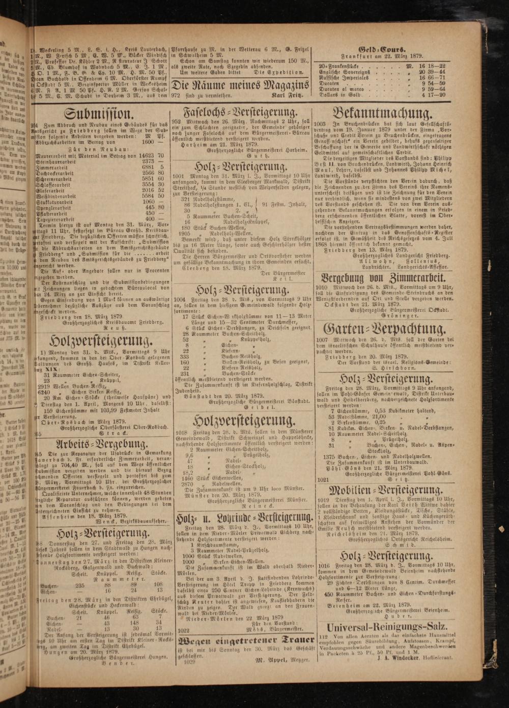 1868 hiermit öffentlich bekannt gemacht. Friedberg den 13. März 1879. Großherzogliches Landgericht Friedberg. All wohn, Follentus, Landrichter. Landgerichts-Assessor.