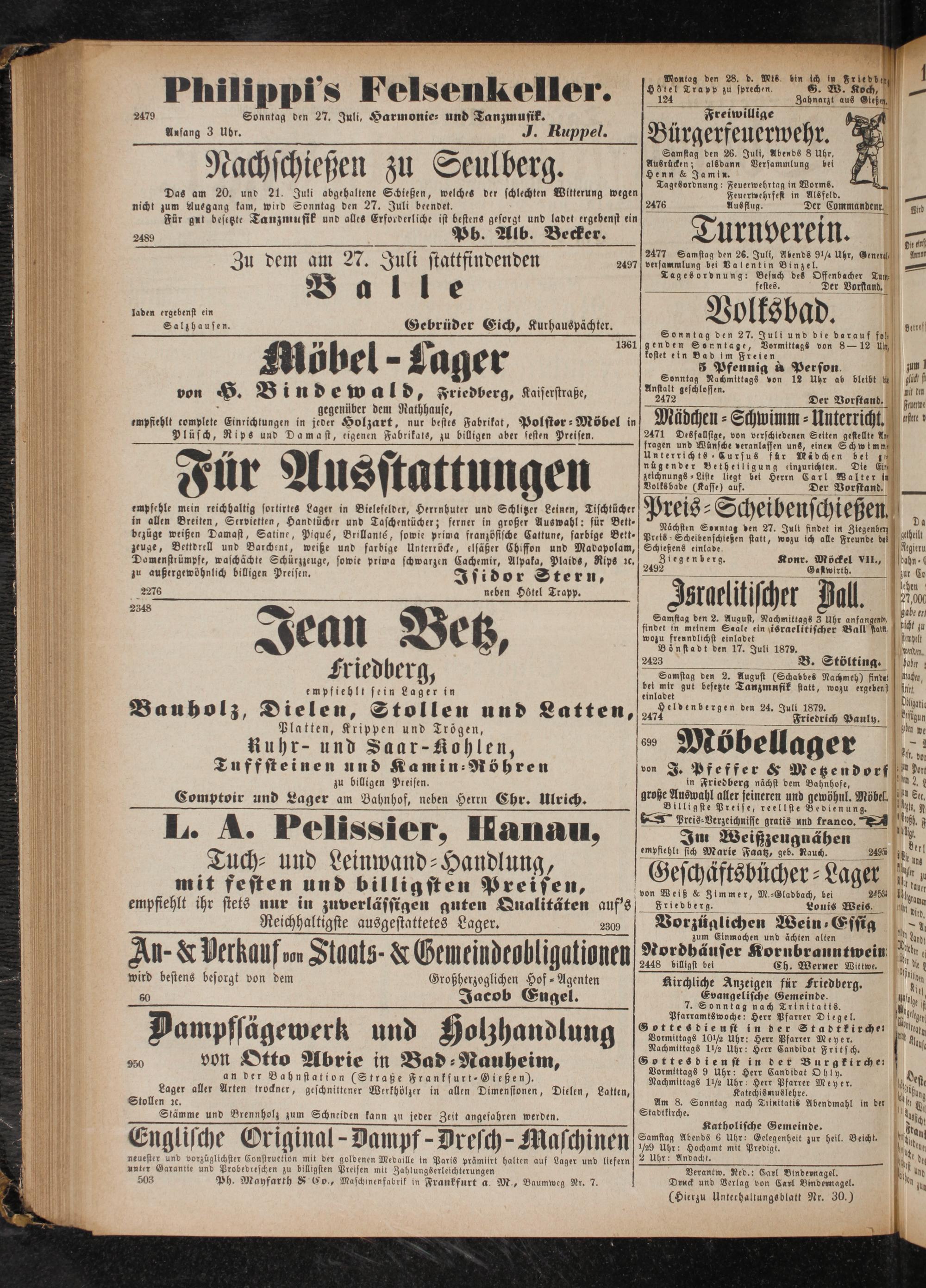 2476 Ausflug. Der Commandenx. Vid Turnverein. die nf 2477 Samstag den 26. Juli, Abends 9½ Uhr, Generd⸗ Aust versammlung bei Valentin Binzel.— Tagesordnung: Besuch des Offenbacher Tu festes. Der— Volksbad. Sonntag den 27. Juli und die darauf 10 genden Sonntage, Vormittags von 8— 12 Uh, kostet ein Bad im Feilen. 5 Pfennig à Person. un! Sonntag Nachmittags von 12 Uhr ab bleibt i glich 1 geschlossen. Alt den Der Vorstand. Fanpe Mädchen ⸗Schwimm⸗Unterricht. 2471 Desfallsige, von verschiedenen Seiten gestellte Ay fragen und Wünsche veranlassen uns, einen Schwi met Unterrichts Cursus für Mädchen bei nügender Betheiligung einzurichten. Die Ei, zeichnungs⸗Liste liegt bei Herrn Carl Walter in ue auf. Der sießen 2 Nächsten Sonntag den 27. Juli 00 in 316. Preis⸗Scheibenschießen statt, wozu ich alle Freunde des fache Schießens einlade. egieru Ziegenberg. Konr. Möckel VII., fan 2492 4 Gastwirth. jur. Co ** 1 J ehen N srarlitischer Dall. Samstag den 2. August, scher 3 Uhr 1 0 findet in meinem Saale ein israelitischer Ball fan, nicht 1 wozu freundlichst einladet umpelt Bönstadt den 17. Juli 1879. Wudden. 2423 B. Stölting. ban Samstag den 2. August(Schabbes Nachmeh) finde! mah, 175 55 gut besetzte Tanzmufik statt, wozu ergebenf fun einlade I enbergen den 24. Jull 1879. e Friedrich Pauly,. shigun „ M nen we öbellager von J. Pfeffer& Metzendorf den in Friedberg nächst dem Bahnhofe, e 2.9 große Auswahl aller feineren und gewöhnl. Möbel. Se Billigste Preise, reellste Bedienung. gts. Preis⸗Verzeichnisse gratis und franco. 10 N U Im Weißzeugnähen 5 empfiehlt sich Marie Faatz, geb. Rauch. 2495 0% 85 U Tal Geschaͤftsbücher⸗Lager von Weiß& Zimmer, M.⸗Gladbach, bei 2450 ilihnn Friedberg. Louis Weis. pn Vorzüglichen Wein⸗Essig zum Einmachen und ächten alten. and Nordhäuser Kornbranntwein n 2448 billigst bei Ch. Werner Wittwe. f f 0 Kirchliche Anzeigen für Friedberg. 0 Evangelische Gemeinde. e 0 7. Sonnkag nach Trinitatts. 5% Pfarramtswoche: Herr Pfarrer Diegel. 1 ligen Gottesdienst in der Stadtkirche an Vormittags 10½ Uhr: Herr Pfarrer Meyer. 7 Kaul Nachmittags 1½ Uhr: Herr Candidat Fritsch. l Gottesdienst in der Burgkirchen Vormittags 9 Uhr: Herr Candidat Ohly. 8 Nachmittags 1¼ Uhr! Herr Pfarrer Meyer. 0 este Katechismuslehre. 0 shung Am 8. Sonntag nach Trinitatis Abendmahl in der 1 Stadtkirche. ug, Katholische Gemeinde. Frau Samstag Abends 6 Uhr: Gelegenheit zur heil. Beicht. c U ½9 Uhr: Hochamt mit Predigt. N bh 2 Uhr: Andacht.* f