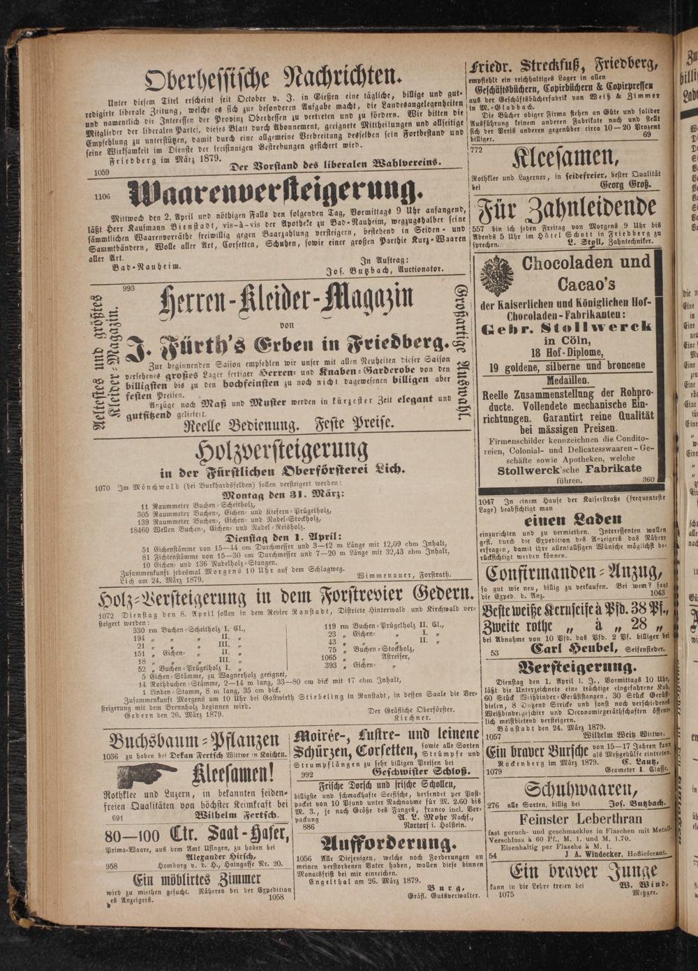 Friedberg im März 1879. 1059 Der Vorstand des liberalen Wahlvereins. 7* „ Maarenversteigerung. 25 Mittwoch den 2. April urd nötbigen Falls den folgenden Tag, Vormittags 9 Uhr N Für Zahnleidende