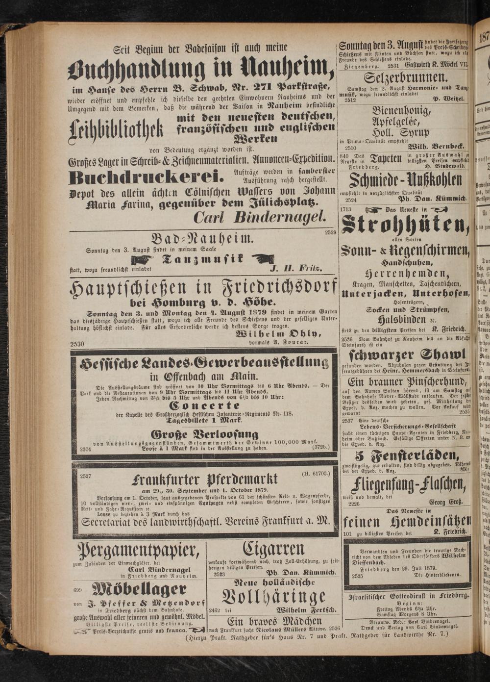 4 Schießens mit Flinten und Büchsen statt, wozu ich alg Freunde des Schießens einlade. 0 uheim Ziegenberg. 2531 Gastwirth K. Möckel VII. f 1. G l Selzerbrunnen. Samstag den 2. August Harmonie und Tanz musik, wozu freundlichst einladet P. Weitzel. ))FCCCCFFC Bienenhonig, 50 hn Apfelgelce, 8 ö— 2 L Holl. Syrup e in Prima-⸗Qualität empfiehlt— 22510 Wilh. Berubeck. 840 Das Hin großer Auswahl Renee in Tl peten binrgpen Preises fl Jb. Friedberg. B. Bindewald. 7 * 0 Schmiede-Uußkohlen empfiehlt in vorzüglichster Qualität 8 uns, daf 2524 f Ph. Dan. Kümmich ah 171¹3 Dias Ueneste in 11 . 5 N Strohhüten, allen Sorten 22 1 1 Sonn- s Regenschirmen, Handschuhen, Dar 97 b 0 iht, zu Herrenhemden, f ö Kragen, Manschetten, Taschentüchern, 7 2 Ni. 2, Unter jacken, Unterhosen, Hosenträgern, Sul Socken und Strümpfen, te M. 7. Halsbinden. a stets zu den billigsten Preisen bei K. Friedrich. Arvoce 2536 Vom Bahnhof zu Nauheim bis an die Abfaß ö 8 Steinfurth ist ein Mehrer über schwarzer Shawl a. gefunden worden. Abzuholen gegen Erstattung der Ji die n. seratgebühren bei Heinr. Hemmers bach in Steinfurth. st. i. inschor kund In ern Ein brauner Pinscherhund, v. auf den Namen Sultan hörend, ist am Samstag alf heblich dem Bahnhofe Nieder-Wöllstadt entlaufen. Der jetze schritd Besitzer desselben wird gebeten, gef. Mittheilung Exped. d. Anz. machen zu wollen. Vor Ankauf wid vollen EE 1 2590 I detselb 2537 Eine deutsche dorch ö Lebens⸗Versicherungs⸗Gesellschaft die po sucht einen tüchtigen Haupt Agenten in Friedberg, Nun— heim oder Butzbach. Gefällige Offerten unter N. B.. schen 925 Exped. d. Anz. dasc „ 8 1 5 Fensterläden, zweiflügelig, gut erbalten, sind billig abzugeben. Nähensn 1 bei der Epped. d. Anz. 850% e 5—— Pilic liegenfung-Flaschen,. ue weiß und bemalt, bei ae 2 ½ũ ee Seorg Gk. Das Neneste in 10 2 2 2* N feinen Hemdeinsätzen 101 zu biligten Praisen, FK. Friedr. en eee ee eee 6 Verwandten und Freunden die traurkge Nach⸗ l richt von dem Ableben des Oberförsters Wilhelm] A. Dieffenbach. 19 1 Friedberg den 29. Juli 1879. der 2525 Die Hinterbliebenen. 1 Nn 0 Aal Israelitischer Gottesdienst in Friedberg. don Beginn: der Freitag Abends 65/ Uhr. fal Samstag Morgens 8 Uhr. 7 bad Verantw. Red.: Carl Bindernagel. in