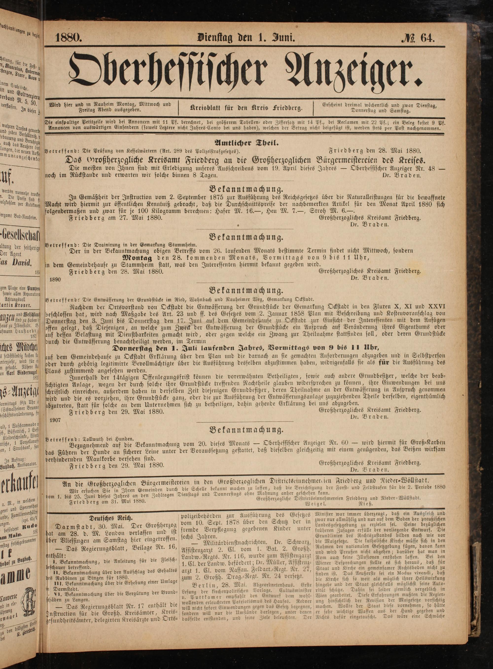Friedberg den 29. Mai 1880. Großherzogliches Kreisamt Friedberg. Dr. Braden. a