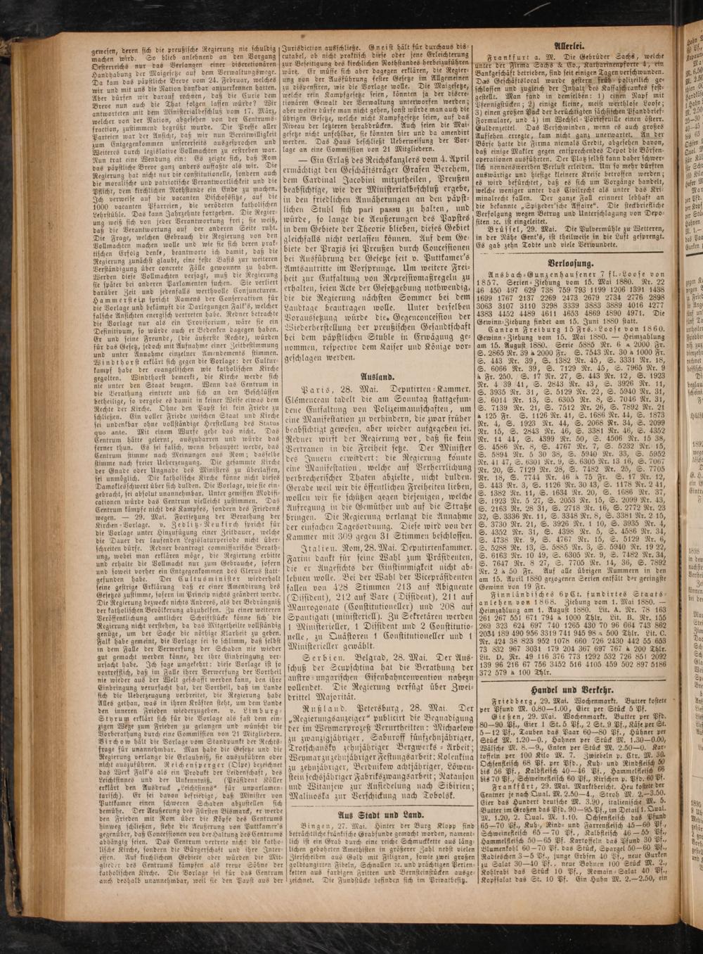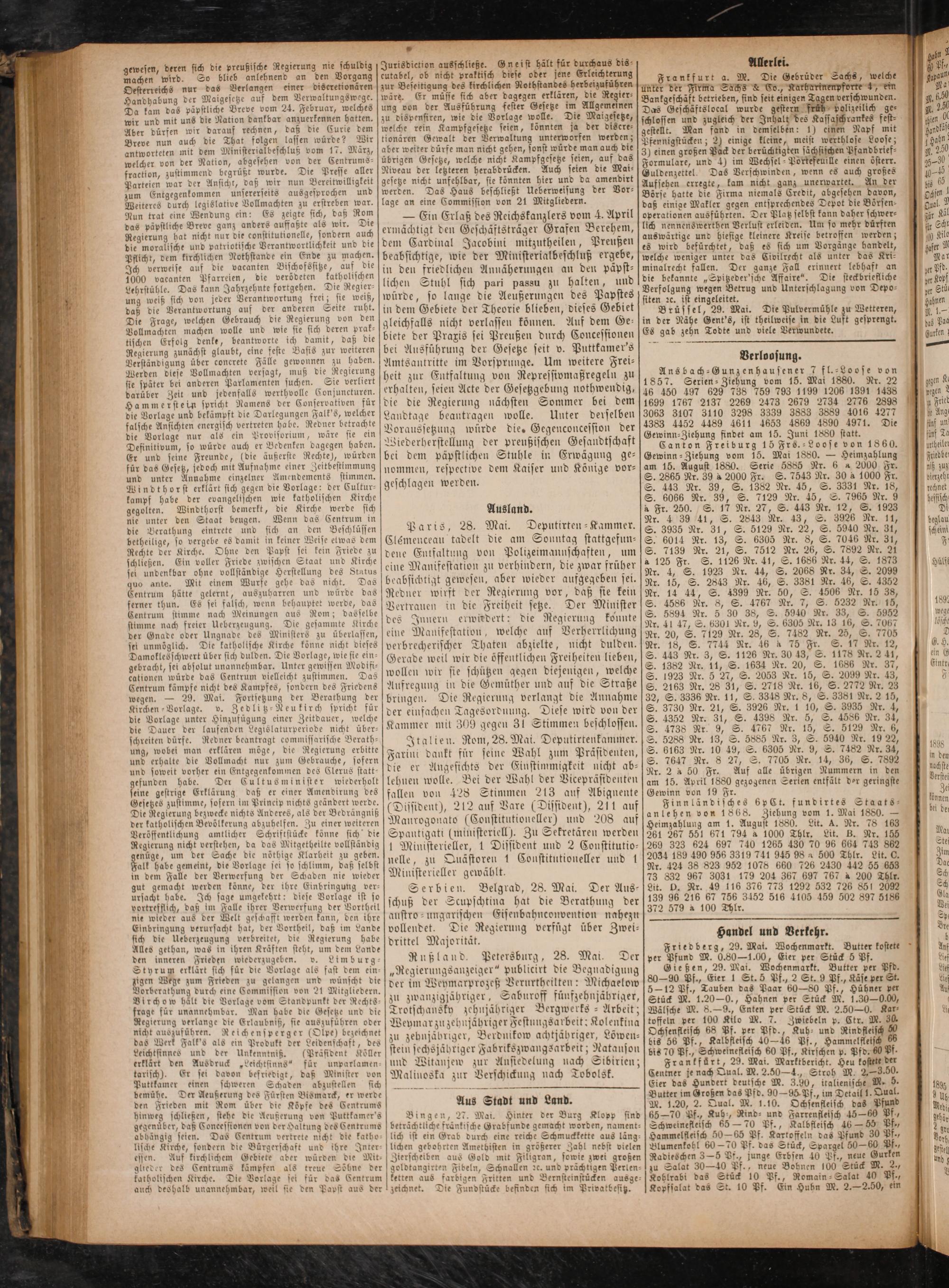 Ans bach-Gunzenhausener 7 fl.⸗Loose von 1857. Serien-Ziehung vom 15. Mai 1880. Nr. 22 46 450 497 629 738 759 793 1199 1206 1391 1438 1699 1767 2137 2269 2473 2679 2734 2776 2898 3063 3107 3110 3298 3339 3883 3889 4016 4277 4383 4452 4489 4611 4653 4869 4890 4971. Die Gewinn⸗Ziehung findet am 15. Juni 1880 statt.