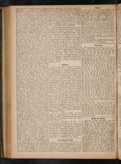 Italien. Rom, 28. Mai. Deputirtenkammer. Farini dankt für seine Wahl zum Präsidenten, die er Angesichts der Eiustimmigkeit nicht ab— lehnen wolle. Bei der Wahl der Vicepräsidenten fallen von 428 Stimmen 213 auf Abignente (Dissident), 212 auf Vare(Dissident), 211 auf Maurogonato(Constitutioneller) und 208 auf Spautigati(ministeriell). Zu Sekretären werden 1 Ministerieller, 1 Dissident und 2 Constitutio— nelle, zu Quästoren 1 Constitutioneller und 1 Ministerieller gewählt.