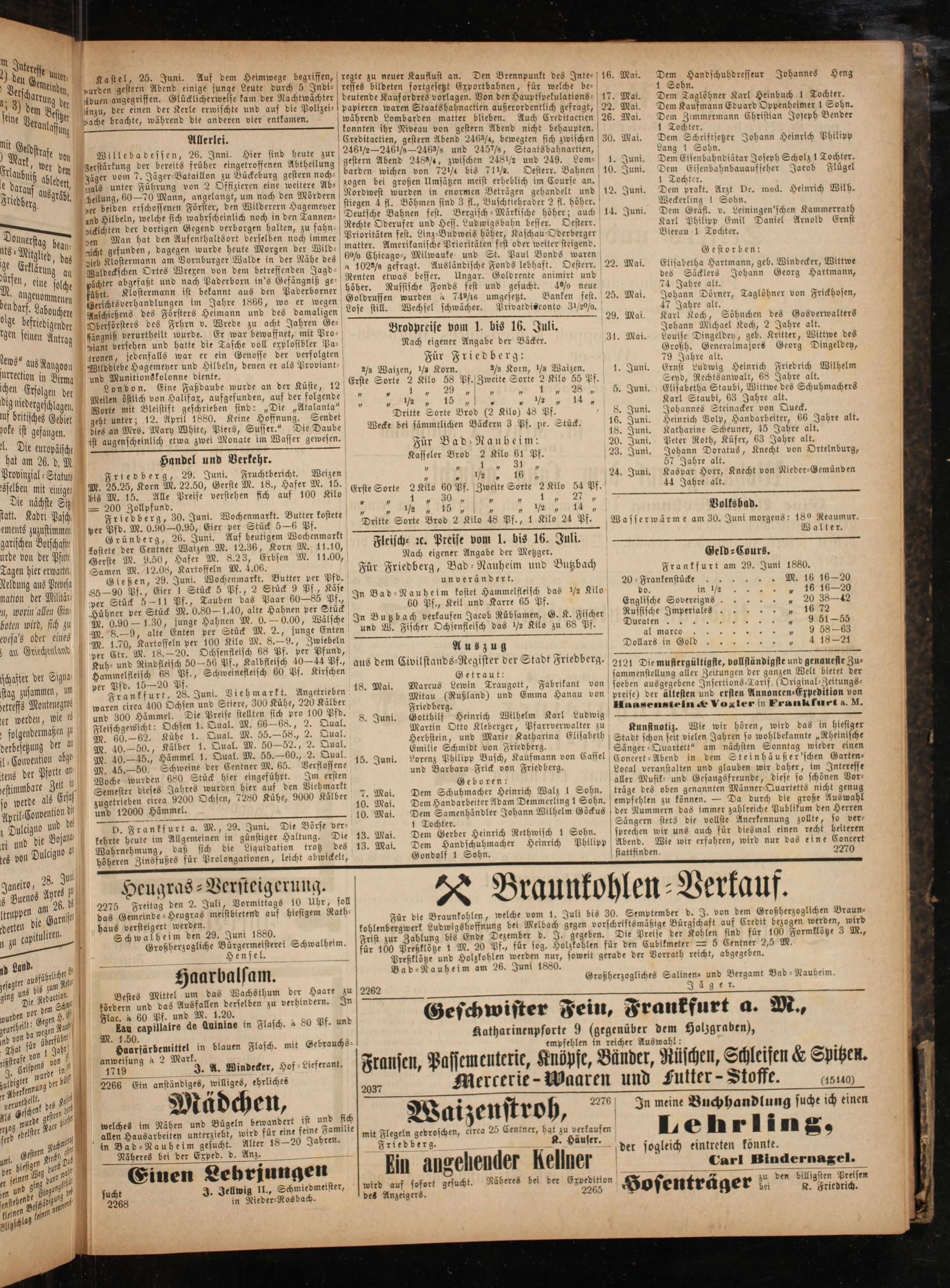 Gerste M. 9.50, Hafer M. 8.23, Erbsen M. 11.00,. Nach eigener Angabe der Meßzger. Geld⸗Cours. Samen M. 12.08, Kartoffeln M. 4.06. Für Friedberg, Bad-Nauheim und Butzbach Frankfurt am 29. Junt 1880. Gießen, 29. Juni. Wochenmarkt. Butter per Pfd. un verändert. 20- Frankenstücke M. 16 16— 20 3 3 Fi Stü Pf. 2 ück 9 Pf 37 f 5 12. eee 1 4 0 55 In Bad-Nauheim kostet Hammelfleisch das ½ Kilo do. in ½„ 16 16—20 per n e 5 85 10 1 0 8 14 60 Pf., Keil und Karre 65 Pf. Englische Sovereigns..„ 20 38—42 Hühner ver Stück M. 0.80— 1.40, alte Hahnen per Stück 5..— Russische Imperiale 16 72 M. 0.90— 1.30, junge Hahnen M. 0.— 0.00, Wälsche In Buß bach verkaufen Jacob Rübsamen, G. K. Fischer 1647 7 9 M. 8.—9, alte Enten per Stück M. 2., junge Enten und W. Fischer Ochsenfleisch das ½¼ Kilo zu 68 Pf. 1 3 N 9 8869 M. 1.70, Kartoffeln per 100 Kilo M. 8.—9., Zwiebeln 25 m.„ 8 per Etr. M. 18.— 20. Ochsenfleisch 68 Pf. per Pfund, Au 53 1 9 5 515 Dae Gold„ 4 19—2ʃ Kuh⸗ und Rindfleisch 50—56 Pf., Tad 1 aus dem Civilstands-Register der Stadt Friedberg. 2121 Die mustergültigste, vollständigste und genaueste Zu⸗ e 5 7 S 2 N* 22 U S 18 imme enen Getraut: sammenstellung aller Zeitungen der ganzen Welt bietet der per Pf i bf t, 28. Juni. Viehmarkt. Angetrieben 18. Mai. Marcus Lewin Traugott, Fabrikant von soeben ausgegebene Insertions⸗Tarif(Original-Zeitungs⸗ anne deter Kühe, 2 8 zälber Mitau(Rußland) und Emma Hanau von preise) der ältesten und ersten Annoncen⸗Eypedition von waren eirea 400 Ochsen un eie. Friedberg. Haasensteln& Vogler in Frankfurt a. M und 300 Hammel. Die Preise zun 0g f 0 un. 8. Juni. Gotthilf Heinnsch Wilhein Karl vudwig. 3 . 08. e ee ee 898197 Martin Otto Kleberger, Pfarrverwalter zu Kunstnotiz. Wie wir hören, wird das in hlesiger — 62..— 90.— 08.*. 9 1 f. 1 2 1 +1 1 8 4 2 40.—50 Kälber 1. Qual. M. 50—52. 2. Qual Herbstein, und Marie Katharina Elisabeth Stadt schon seit vielen Jahren so wohlbekannte„Rheinische 1 40. 15. Hämmel 1. Qual. M. 55—60., 2. Qual. Emilie Schmidt von Friedberg. Saänger⸗Quartett“ am nächsten Sonntag wieder einen * 8 1 Seid der Centner M. 65 Verflossene 15. Juni. Lorenz Philipp Busch, Kaufmann von Cassel Concert-Abend in dem Steinhäußer'schen Garten⸗ 7 eben 680 Stück hier eingefuhrt. Im ersten und Barbara Frick von Friedberg. Local veranstalten und glauben wir daher, im Interesse Semester dieses Jahres wurden hier auf den Viehmarkt Geboren:. aller Musik und Gesangsfreunde, diese so schönen Vor⸗ trieben eirea 9200 Ochsen, 7280 Kühe, 9000 Kälber 7. Mai. Dem Schuhmacher Heinrich Walz 1 Sohn. träge des oben genannten Männer⸗Quartetts nicht genug —— 4 12000 Hömmel f a 10. Mai. Dem Handarbeiter Adam Demmerling 1 Sohn. empfehlen zu können.— Da durch die große Auswahl —— a 10. Mai. Dem Samenhändler Johann Wilhelm Göckus der Nummern das immer zahlreiche Publikum den Herren ). Frankfurt a. M., 29. Juni. Die Börse ver⸗ 1 Tochter. Sängern stets die vollste Anerkennung zollte, so ver⸗ kehrte heute im Allgemeinen in günstiger Haltung. Die 13. Mai. Dem Gerber Heinrich Rethwisch 1 Sohn. sprechen wir uns auch für diesmal einen recht heiteren Wahrnehmung, daß sich die Liquidation trotz des 13. Mai. Dem Handschuhmacher Heinrich Philipp Abend. Wie wir erfahren, wird nur das eine Concert höheren Zinsfußes für Prolongationen, leicht abwickelt, Gondolf 1 Sohn. stattfinden. 2270 222 1 7 Hehe nenegenun Braunkohlen⸗Verkauf 5— 2275 Freitag den 2. Juli, Vormittags 10 Uhr, soll* 2 1 3 1 3 8— das Gemeinde Heugras meistbietend auf biesigem Rath Für die Braunkohlen, welche vom 1. Juli bis 30. Semptember d. J. von dem Großherzoglichen Braun⸗ haus versteigert werden. kohlenbergwerk Ludwigshoffnung bei Melbach gegen vorschriftsmäßige Bürgschaft auf Credit bezogen werden, wird