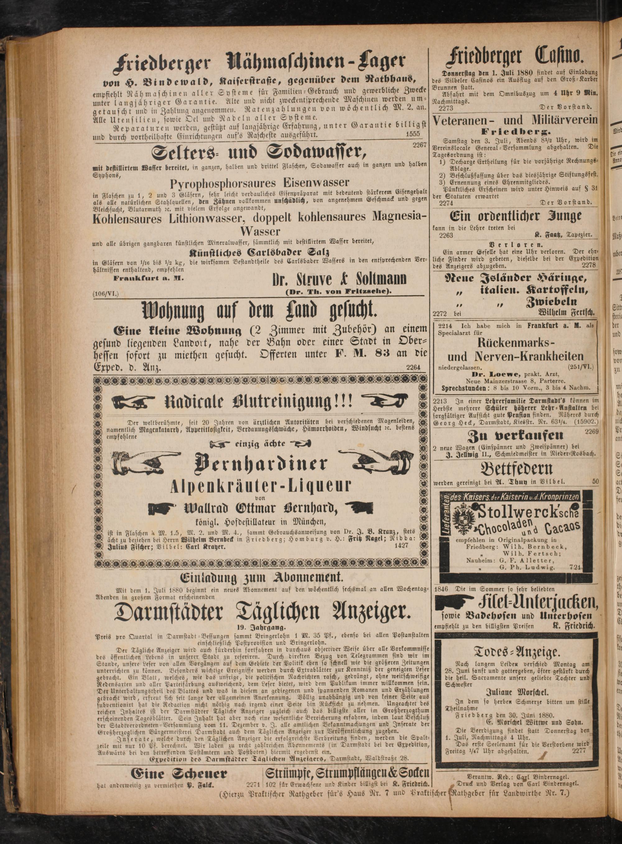 Mit dem 1. Juli 1880 beginnt ein neues Abonnement auf den wöchentlich sechsmal an allen Wochentag— Abenden in großem Format erscheinenden