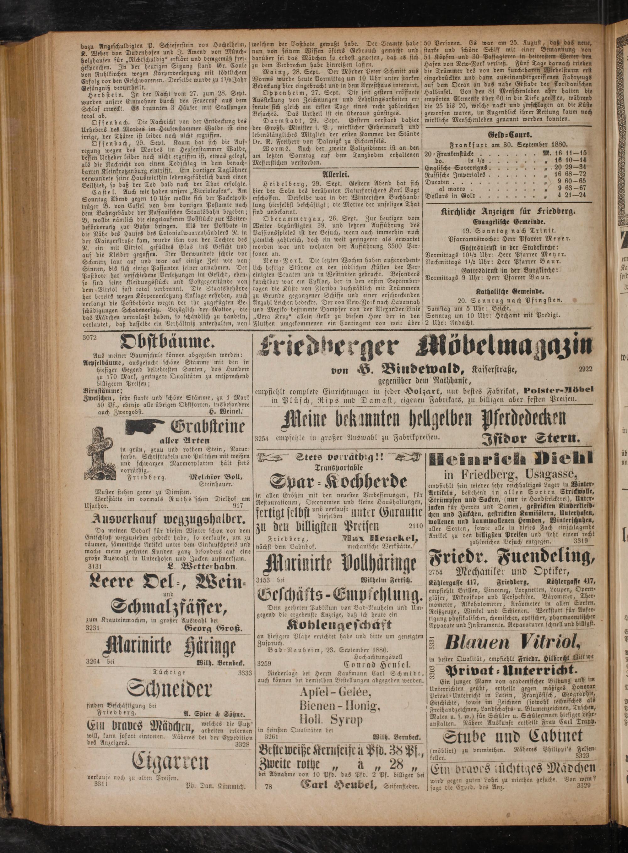 Kirchliche Anzeigen für Friedberg. Evangelische Gemeinde. 19. Sonntag nach Trinit. Pfarramtswoche: Herr Pfarrer Meyer. Gottesdienst in der Stadtkirche: Vormittags 10½ Uhr: Herr Pfarrer Meyer. Nachmittags 1½ Uhr: Herr Pfarrer Baur.