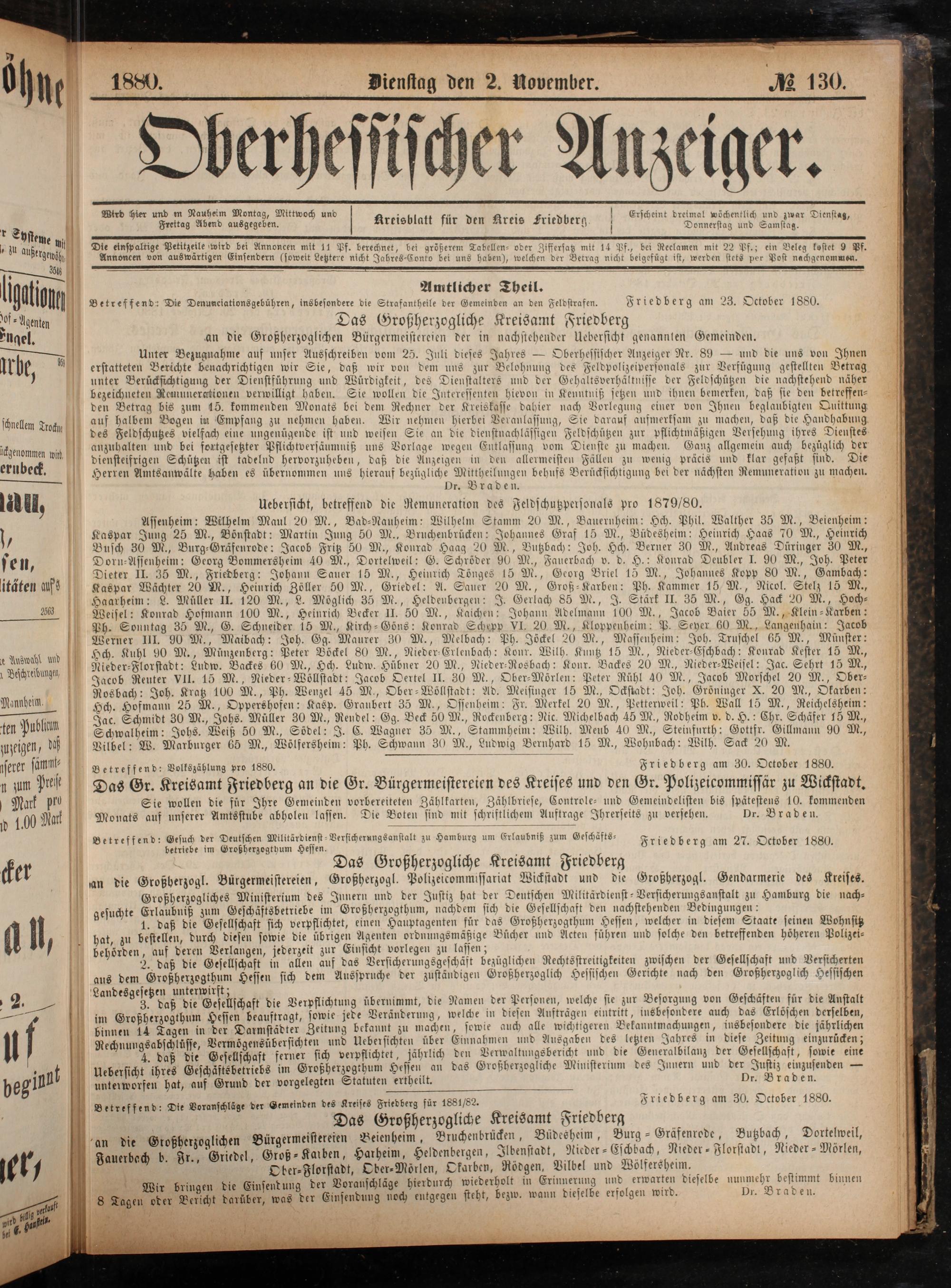 Amtlicher Theil. Betreffend: Die Denunciationsgebühren, insbesondere die Strafantheile der Gemeinden an den Feldstrafen. Friedberg am 23. October 1880. Das Großherzogliche Kreisamt Friedberg an die Großherzoglichen Bürgermeistereien der in nachstehender Uebersicht genannten Gemeinden.