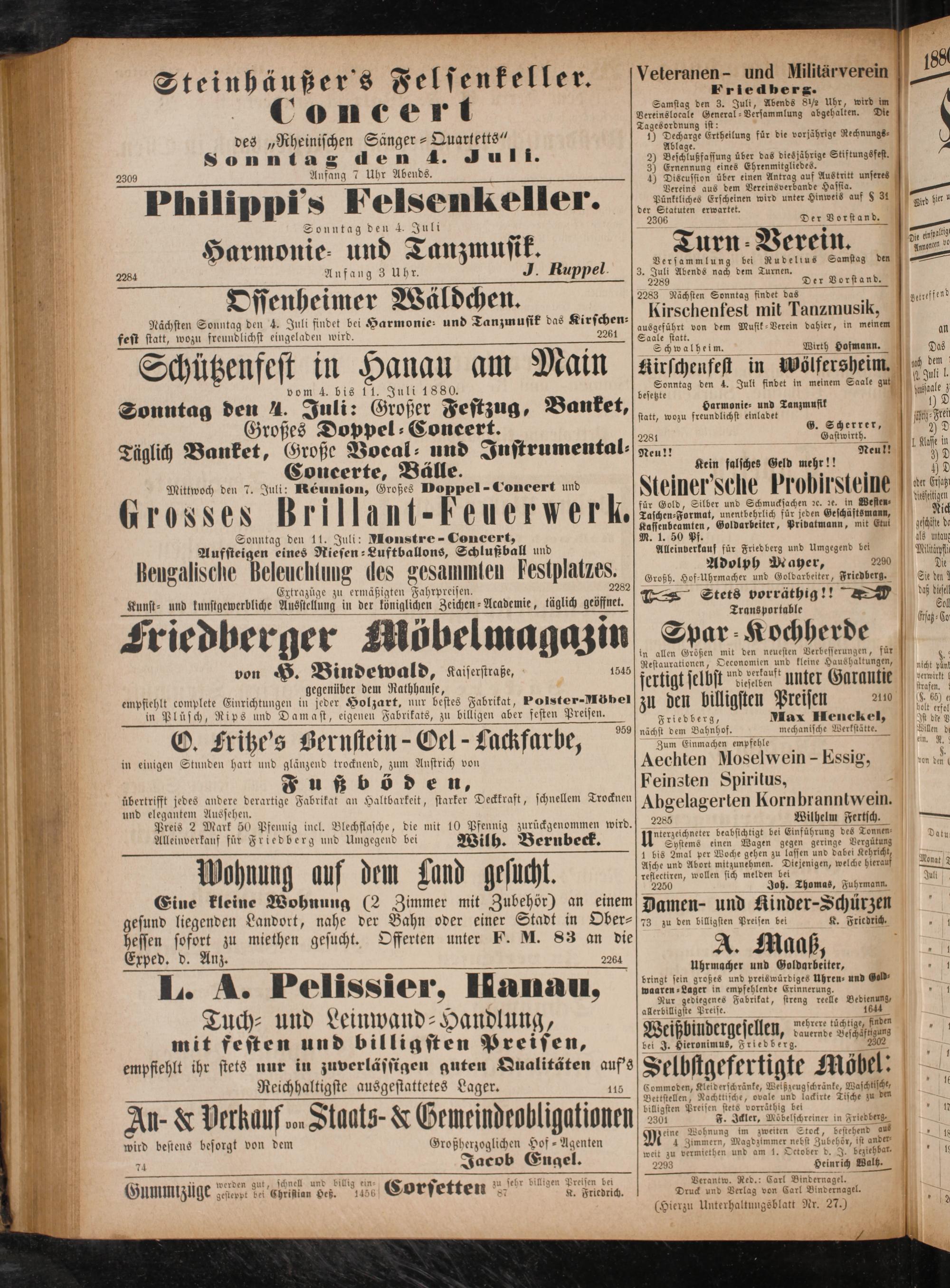 2309 Anfang 7 Uhr Abends. Philipps Felsenkeller. b ankaß den 4. Juli 3 Harmonie und Tanzmusik. 2284 Anfang 3 Uhr. J. Ruppel.