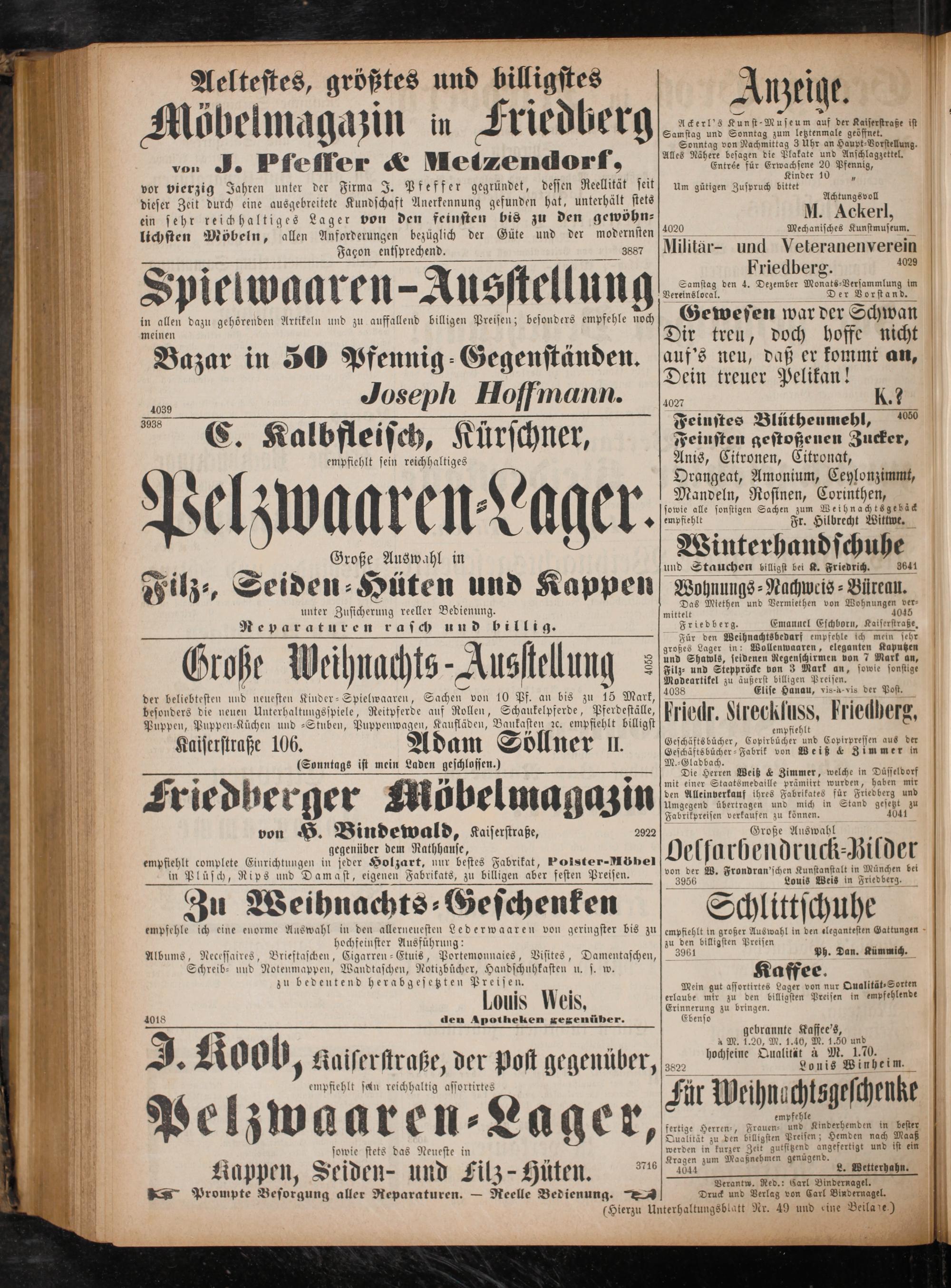 Die Herren Weiß& Zimmer, welche in Düsseldorf mit einer Staatsmedaille prämiirt wurden, haben mir den Alleinverkauf ihres Fabrikates für Friedberg und Umgegend übertragen und mich in Stand gesetzt zu Fabrikpreisen verkaufen zu können. 4041