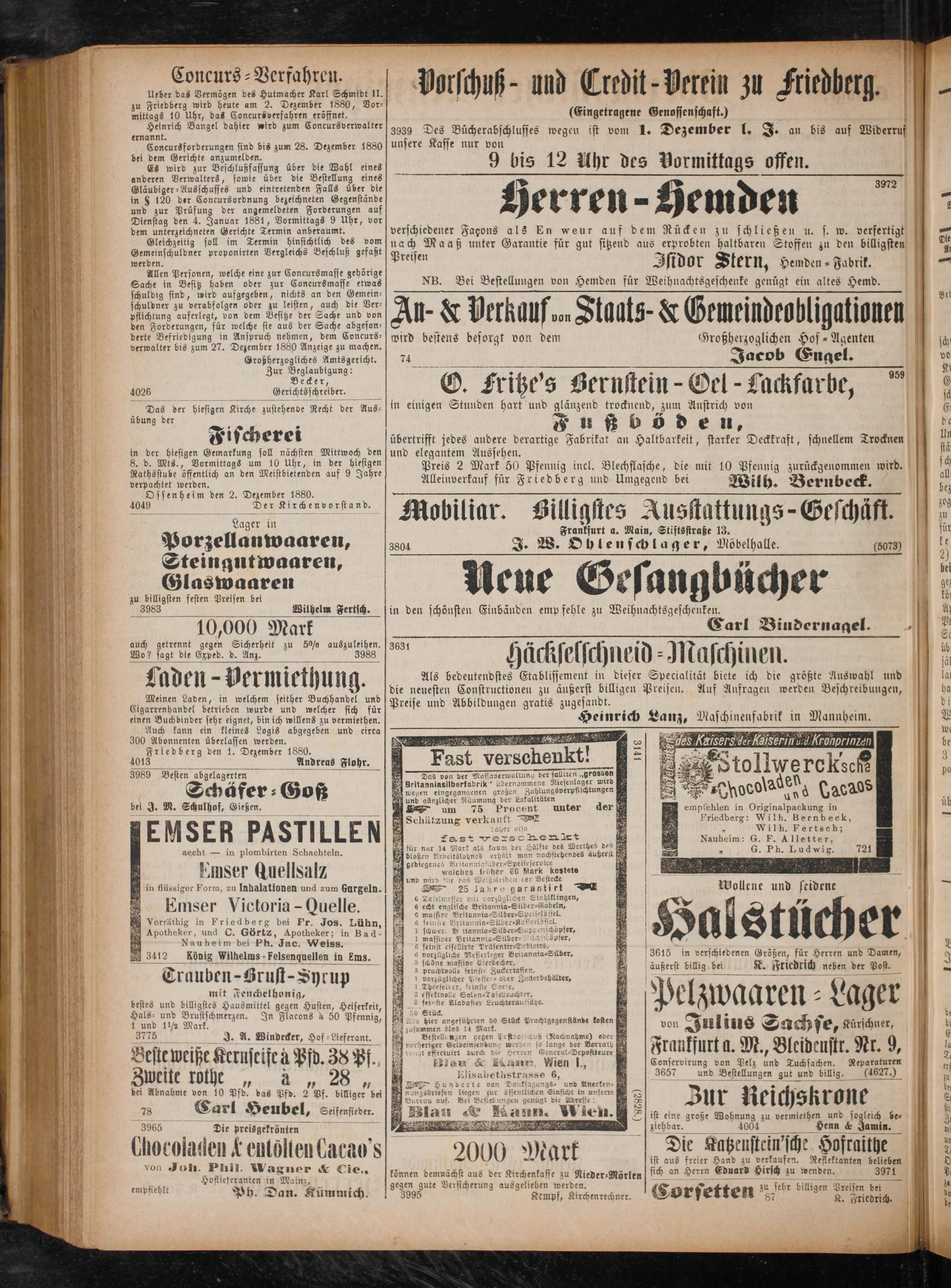 Ueber das Vermögen des Hutmacher Karl Schmidt II. zu Friedberg wird heute am 2. Dezember 1880, Vor⸗ mittags 10 Uhr, das Concurs verfahren eröffnet.