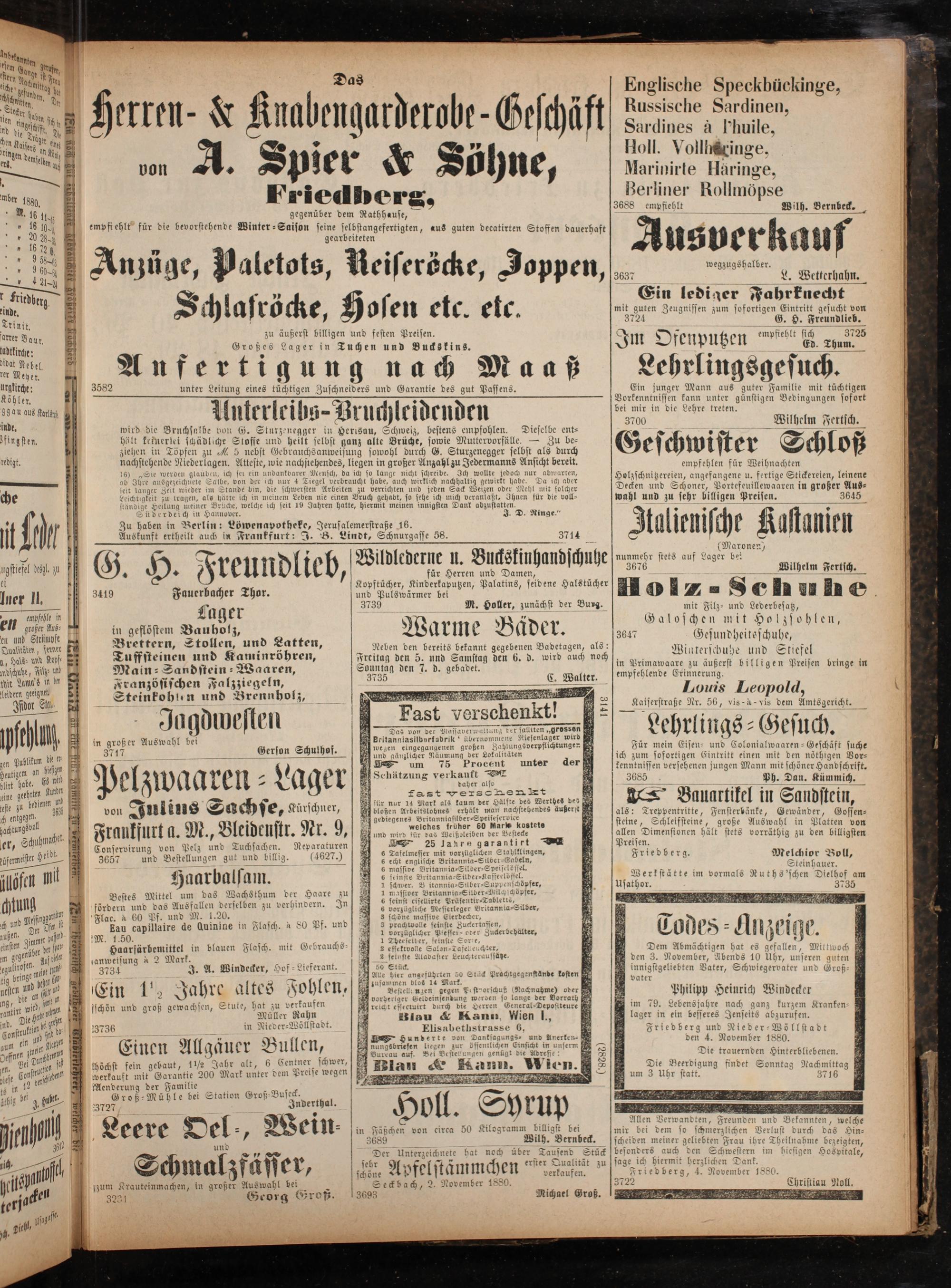 5 Philipp Heinrich Windecker im 79. Lebens jahre nach ganz kurzem Kranken⸗ lager in ein besseres Jenseits abzurufen. Friedberg und Nieder⸗Wöllstadt den 4. November 1880. Die trauernden Hinterbliebenen.