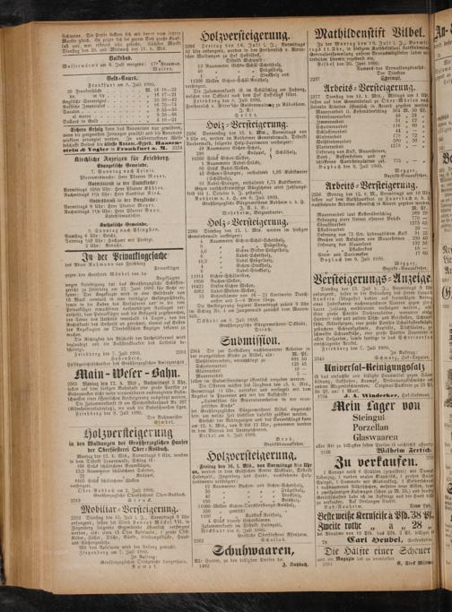 g— 3 M. 3— Die Zusammenkunft ist im Schälschlag am Fußweg, 1 A 5 5 welcher von Ockstadt nach dem Hof Hasselheck führt.—. d 8 g gase Sl t eee de Been ale e bin Geh 0. BK en 2„ 10—4 rei f 3 1 ts 5 im. 5 0 4 Ann„ 9 53—58 Freiherrlich v. iin zu Rüdesheim stehende Arbeiten öffentlich in Accord gegeben werden al marco„ 9 58—66 Heid Maurerarbeit lt. Kostenüberschlag 304 M. 30 Pf. Dollars in Gold.„ 418—21—— 5 Steinhauerarbeit 49 . 2 1 Zi beit 51 12 Sichern Erfolg kann das Annoneiren nur gewähren, Holz 5 Versteigerung. 8 116 5 60 1 wenn die geeignetsten Zeitungen gewählt und die Annoncen[2356 Donnerstag den 15. d. Mts., Vormittags von] Schlosserarbeit 4335 wirksam arrangirt werden. In unübertroffener Weise 9 Uhr an, werden im Rodheimer Gemeindewald, Distrikt] Glaserarbeit 178. beschafft Beides die älteste Annonc. Exped. Hansen Vorderwald, folgende Holz⸗Sortimente versteigert: Weiß binderarbeit 560 20 1. steln& Vogler in Frankfurt u. M. 2234 9 Raummeter elch n N Planierarbeit„ 10 5 8 s 8 5 298 5 5 nüppel Schälholz Lieferung von Kalk, Mauersteinen 1— Kirchliche Anzeigen für Friedberg. 10360 Stück Eichen⸗Wellen,. 5 Sand, Russensteinen und ge⸗ Ebangelische Gemeinde. 1 Raummeter Nadel⸗Stöcke, schliffenen Sandsteinplatten zu.. 775 7—„ 0 7. Sonntag nach Trinit. 80 Stück Nadel-⸗Wellen, Butzbach den 9. Juli 1880. Pfarramtswoche: Herr Pfarrer Meyer. 43 Eichen⸗Stangen, enthaltend 1,95 Kubikmeter Metzger, Bü De 3 2 2 Schälho Bezirks⸗ e 0 G Stadtkirche:.(Schältolz), Bezirks⸗Bauaufseher. dag W 3 ottesdienst in der Sta tkirche: 81 Nadel⸗Stangen, enthaltend 1,75 Kubikmeter. 55 3 5 7 Wigan Vormittags 10¼ Uhr: Herr Pfarrer Köhler. Gegen vorschriftsmäßige Bürgscheine wird Zahlungs⸗ Arbeits 2 Versteigerung. uu, Ul Nachmittags 1½ Uhr: Herr Candidat Nies. frist bis 1. October d. J. gestattet. 5. 1 male Gottesdienst in der Burgkirche: Rodheim v. d. H. am 6. Juli 1880. salen uf e e 8 N N llasete Vormittags 9 Uhr: Herr Pfarrer Meyer. Großherzogliche Bürgermeisterei Rodheim v. d. H.. dal b v. d. H„n me Nachmittags 1½¼ Uhr: Herr Pfarrer Baur. 8 93 7 1 85 15 nachstehende Arbeiten öffentlich in Accord deres E 8 11 T. 1 4 Katechismus lehre. 9.. Maurerarbeit laut Kostenüberschla 369 20 5 f i* 3 Koi Erbauung einer kleinen eisernen Brücke 7 ahlung b. e berg. Holz ⸗Versteigerung. Chansstrarbeit 1375 65 f e, Samstag 6 e nach Pfingsten. 2360 Dienstag den 13. l. Mts“ werden im hiesigen] Pflasterarbeit 20— knen Ste 17½29 Uhr! Hochomt mit Predigt Gemeindewald versteigert: 5 5 Lieferung von 75 Ctr. hydraulischem Kalk 91 25 5 55 8 4 Ubr: Andacht 5 4 Raummeter Eichen⸗Schäl⸗Scheitholz, Brechen und Anfahren von Mauersteinen 230 40 : t. 8 1 905 852 e Lieferung von Mauersand 132 50 5 7 4õ6„ ichen⸗Birken⸗Prügelholz, 1„ Pflasterkies 15- Mes a Ju der Privatklagesache 6 5 Nadel- Scheitholz, Stein- und Sandmessen 17 60 Nei des Adam Rohmann von Friedberg 1 9„ i Butzbach den 9. Juli 1880. 1 Lie Privatkläger„ Lichen⸗Stochoiz, etzger, gegen den Gottfried Mändel von da 1975 4 neee„ Bezirks⸗Bauaufseher. Ar Angeklagter Fichen⸗Schälwellen, 5 5—.—— g Wale be galiches Sclzffen⸗ 1950 Buchen W 5 A ige ade we gare, 2, Jantzen dende ae Versteigerungs⸗Anzeige nt: Der Angeklagte wirb eine Geldstrafe von 4062 Nadel⸗Weiden-Wellen, Dienstag den 13. Juli d. J., Vormittags 9g u 15 Mark eventuell in eine dreitägige Gefängnißstrafe, 10 Eichenstämme von 16— 22 Centimeter Durch- anfangend, sollen in der Behausung des Herrn Leopolh sowie in die Kosten des Verfahrens und in die dem messer und 5—6 Meter Länge. Arnstein(Usagasse) dahier auf freiwilligen Antroz 9 0 Privatkläger erwachsenen nothwendigen Auslagen ver⸗ Die Versteigerung beginnt Vormittags präeis 9 Uhr eines Fabrikanten nachverzeichnete Waaren gegen glei urtheilt, dem Privatkläger auch die Befugniß zugesprochen, 5 Nr. 4 am Jungenwald zunächst dem Marien⸗ 62 Se 19 1 werden, als 1809 den T des Urtheils innerhalb 14 Tagen, von der ld. Fine große arthie Dreherarbeiten, worunter einig Rechtskraft des Urtheils— ee 3 auf Kosten Ockstadt am 8. Juli 1880.. Hundert rohe und polirte Tisch⸗ und Bettstellen, Schranß des Angeklagten im; Oberhessischen Anzeiger bekannt zu Großherzogliche Bürgermeisterei Ockstadt. füße, Möbelspitzen, eine große Parthie Schubkastenknöpfe. ec 0 5 Dienst. gestochene Schrankgesimse, Kapitäle, Tischsäulen, 6 1 Die Richtigkeit der Abschrift der Urtheilsformel wird— 122 schweifte Schrankfüße, eine große Parthie Fourniere it 2 beglaubigt und die Vollstreckbarkeit des Urtheils be— Submisston. e sonstige in das Schreinerfatz 2 einigt. Aleinschlagende Artikel. 1 5 iert den 7. Juli 1880. 23612364 Die zur Herstellung nachbenannter Arbeiten in Friedberg den 7. Juli 1880. a 2 5 Hoden stein, der evangelischen Kirche zu Vilbel, als: M. Pf. f 25 In Auftrag: 1 N Hülfsgerichtsschreiber des Großherzoglichen Amtsgerichts. n veranschlagt zu 12 1 2348 Schwarz, Hof⸗Taxator. 2 * D hreinerarbeit 2—— 5 Main-Weser- Bahn. Se„ Aniversal-Reinigungssatz .— fit das einfachste und billigste Hausmittel gegen Säur