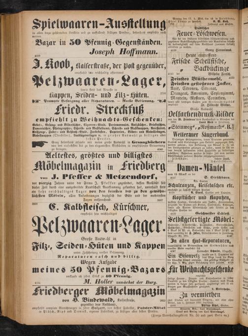 hauptsächlich im Modernisiren der Seidenhüte nach neuester Mode empfiehlt sich 4047 Hutmacher Schmidt, Usagasse. wurde am 3. Dezember auf Ein Bisonpelz dem Wege durch die Burg die SA hinauf verloren. Um gefällige Rückgabe an die Exp. d. Anz. gegen Belohnung wird gebeten. 4128