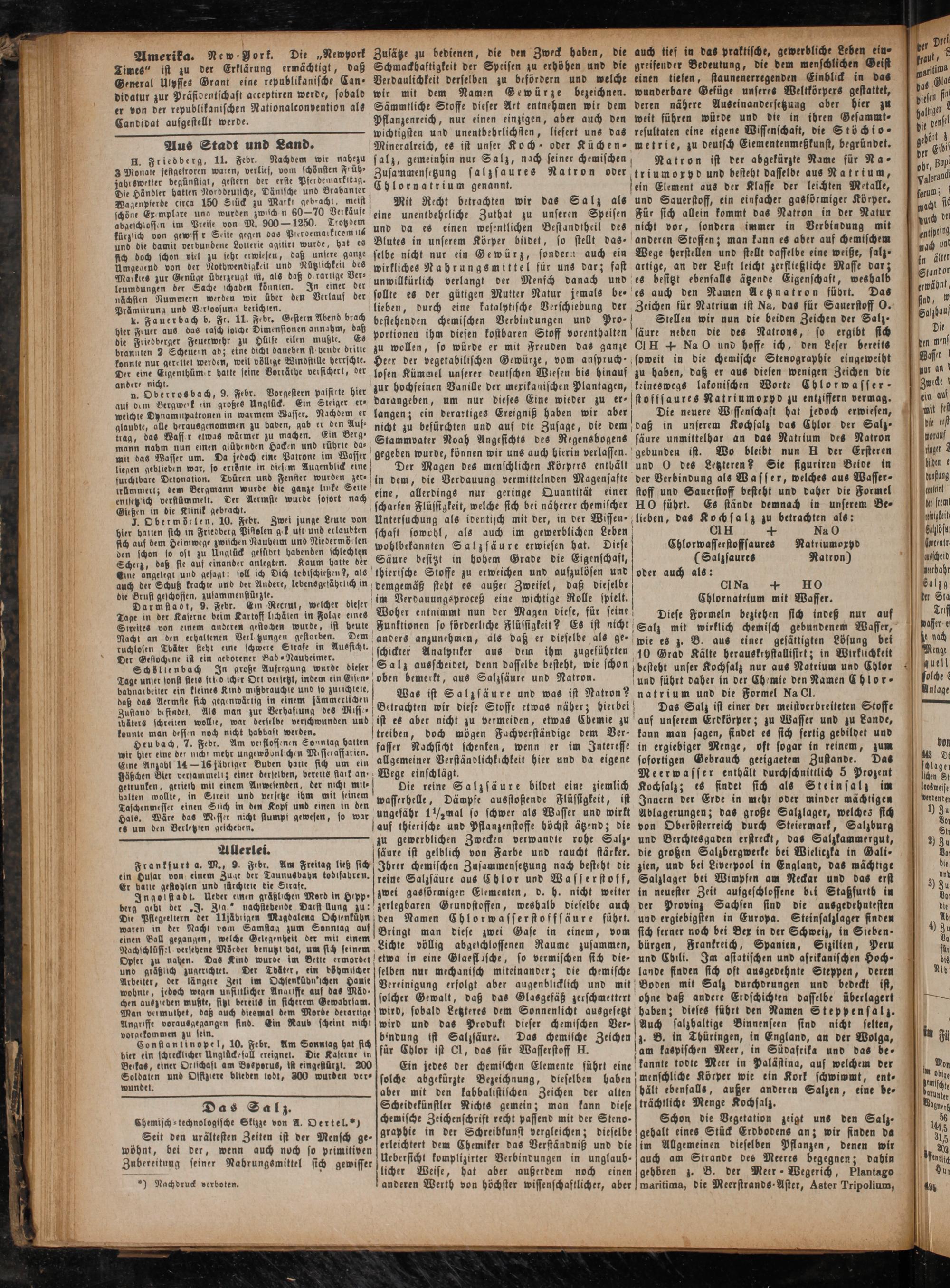 Die neuere Wissenschaft hat jedoch erwiesen, daß in unserem Kochsalz das Chlor der Salz- säure unmittelbar an das Natrium des Natron gebunden ist. Wo bleibt nun H der Ersteren und O des Letzteren? Sie figuriren Beide in der Verbindung als Wasser, welches aus Wasser⸗ stoff und Sauerstoff besteht und daher die Formel